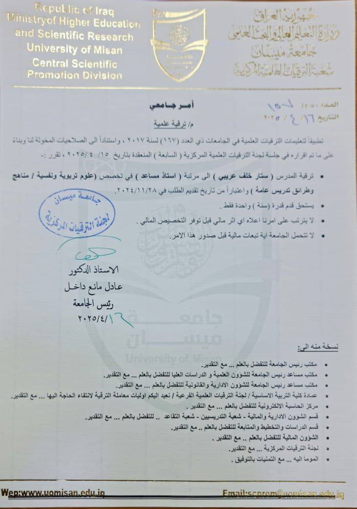 بمناسبة الاحتفال بالذكرى السنوية لتأسيس جامعة ميسان وبتوجيه عميد كلية التربية الأساسية الدكتور عمار جبار حسين الوهج بادر التدريسي في قسم معلم الصفوف الأولى بعمل