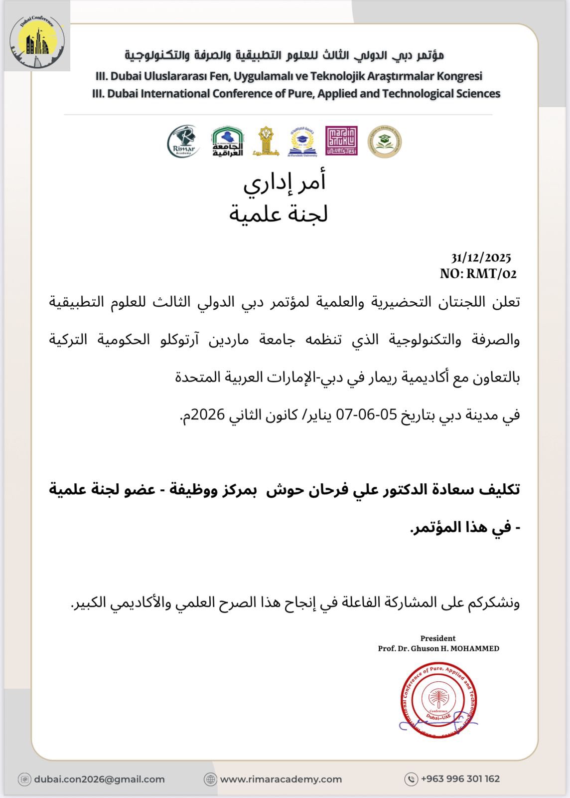 كما صدر أمر إداري باختياره عضوًا في اللجنة العلمية للمؤتمر، في خطوة تعكس الثقة بإسهاماته العلمية ودوره الفاعل في دعم المسيرة البحثية على المستويين الإقليمي والدولي.