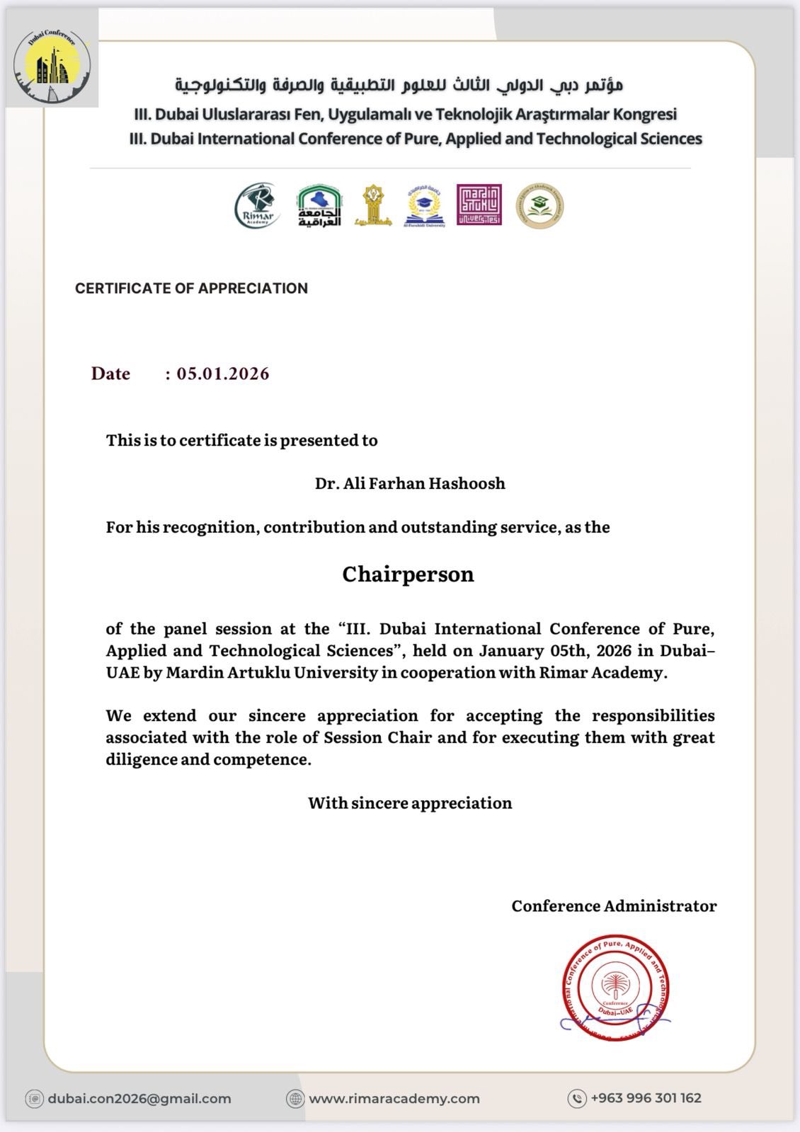 اختير التدريسي في جامعة ميسان / كلية التربية الأساسية / قسم الرياضيات، الدكتور علي فرحان حاشوش، رئيسًا لإحدى جلسات النقاش في مؤتمر دبي الدولي الثالث للعلوم التطبيقية والصرفة والتكنولوجية، الذي أُقيم في مدينة دبي – دولة الإمارات العربية المتحدة، بتنظيم من جامعة ماردين أرتوكلو وبالتعاون مع أكاديمية ريمار.