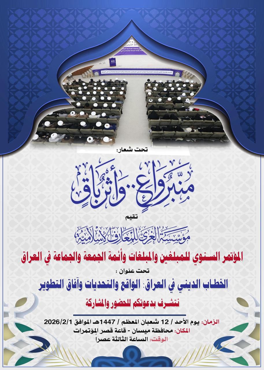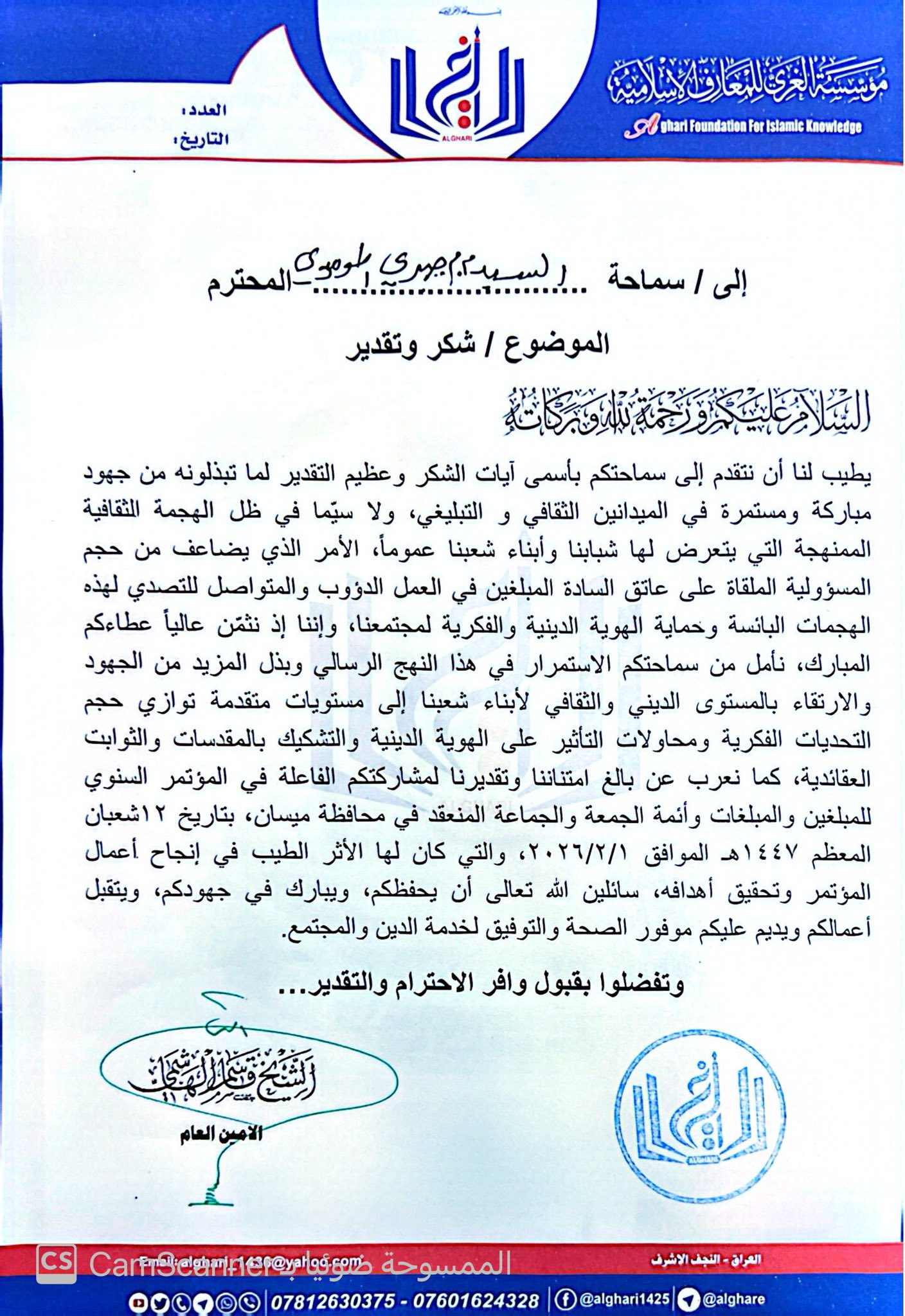 وجاء هذا التكريم تقديرًا لمشاركته المتميزة في المؤتمر السنوي للمبلغين والمبلغات وأئمة الجمعة والجماعة، المنعقد في محافظة ميسان بتاريخ (1–2 شعبان المعظم 1447هـ) الموافق (2026/2/1)، لما كان لها من أثر إيجابي في إنجاح أعمال المؤتمر وتحقيق أهدافه.