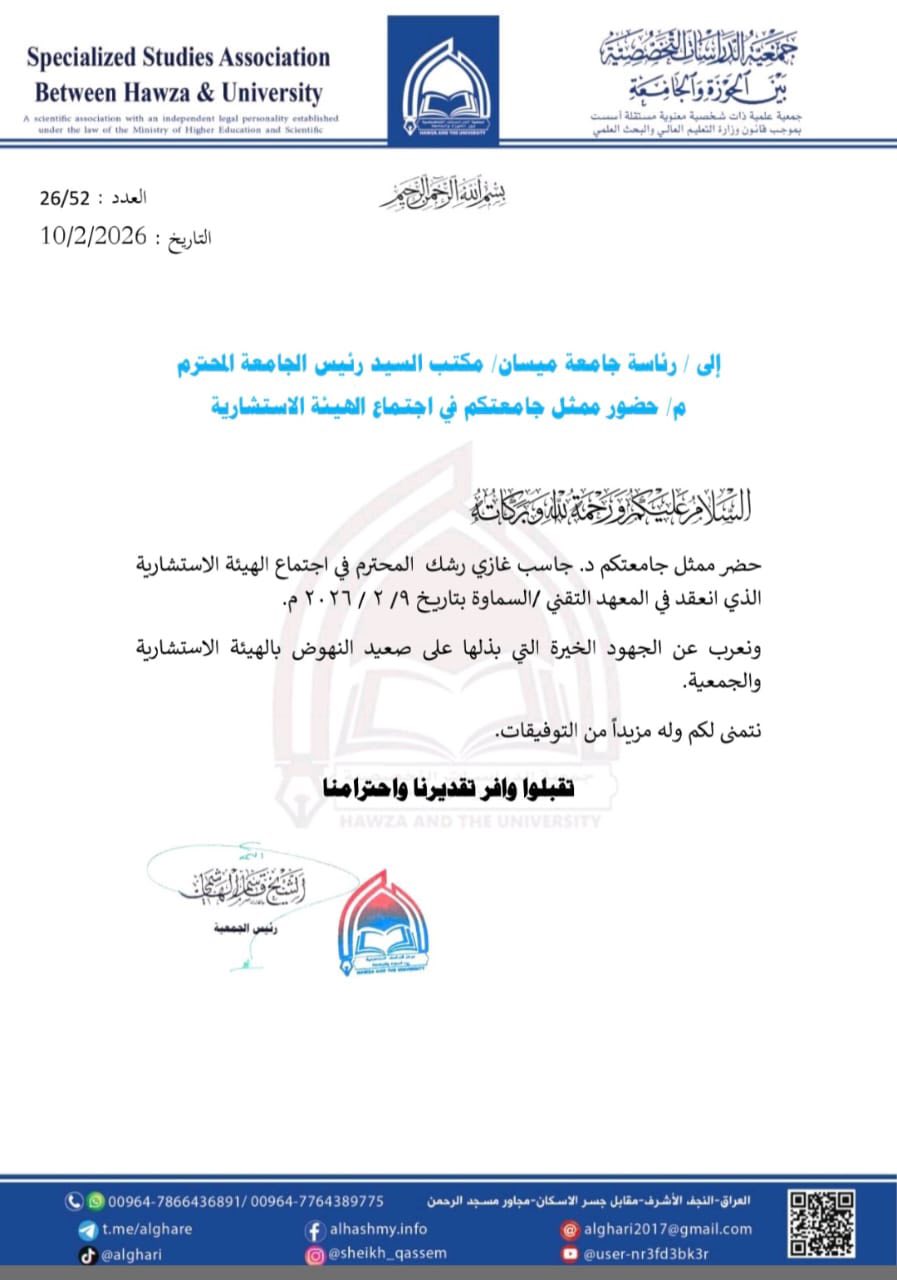 شارك الأستاذ الدكتور جاسب غازي رشك رئيس قسم التربية الاسلامية كلية التربية الاساسية جامعة ميسان في أجتماع الهيئة الاستشارية لجمعية الدراسات المتخصصة بين الحوزة والجامعة والذي عقد في المعهد التقني السماوة حيث استعرض الاجتماع أبرز النشاطات الدراسية بين الجامعة والحوزة ومناقشة خطة العام الدراسي الجديد والتواصل بين المؤسستين .. في ختام اللقاء طرحت مجموعة من الأفكار والرؤى للخروج بتوصيات مهمة من شأنها المساهمة بتطوير الواقع العلمي والتربوي في الجامعا