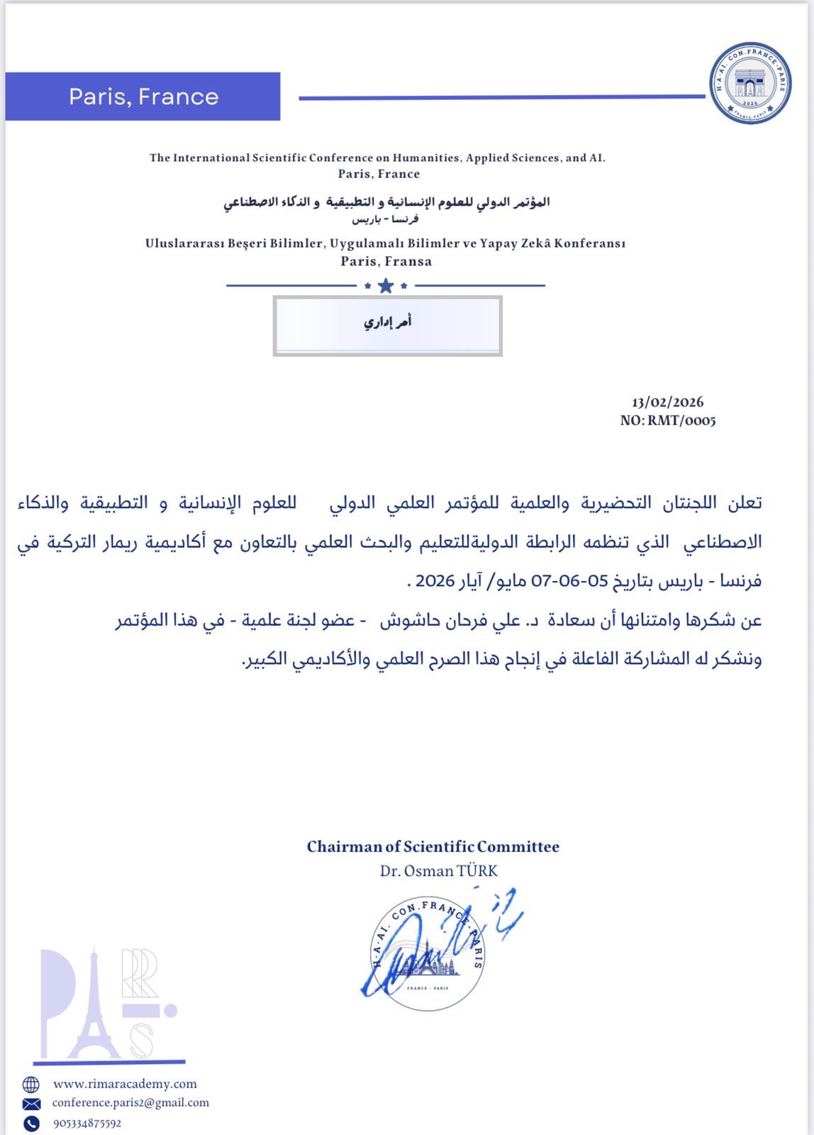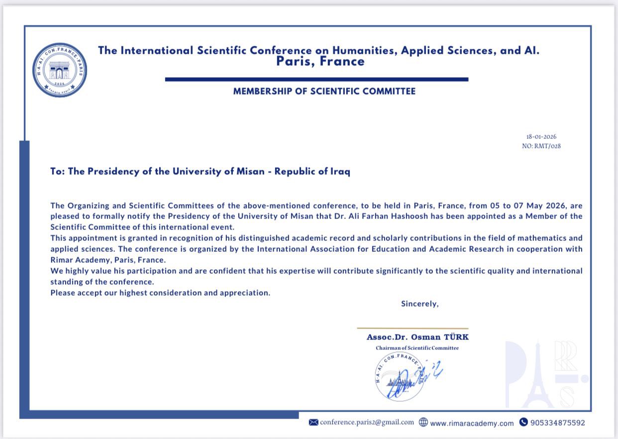 اختير التدريسي في جامعة ميسان / كلية التربية الأساسية / قسم الرياضيات، المدرس الدكتور علي فرحان حاشوش، عضواً في اللجنة العلمية للمؤتمر العلمي الدولي الموسوم «العلوم الإنسانية والعلوم التطبيقية والذكاء الاصطناعي»، الذي تنظمه International Association for Education and Academic Research بالتعاون مع Rimar Academy، والمزمع عقده في Paris – France بمشاركة نخبة من الباحثين والأكاديميين من مختلف دول العالم.