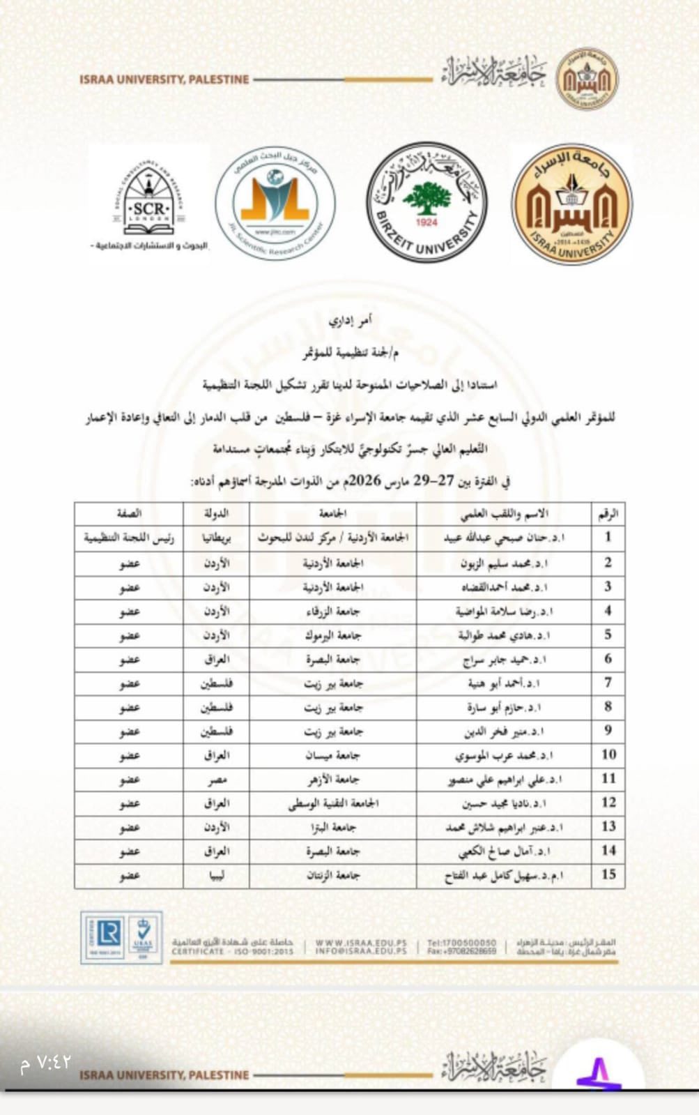 شارك الأستاذ الدكتور محمد عرب الموسوي، رئيس قسم الجغرافيا في كلية التربية الأساسية، عضواً في أعمال المؤتمر العلمي الدولي السابع عشر الذي أقامته جامعة الإسراء في غزة – فلسطين، تحت عنوان: “من قلب الدمار إلى التعافي وإعادة الإعمار: التعليم العالي جسرٌ تكنولوجي للابتكار وبناء مجتمعات مستدامة”.