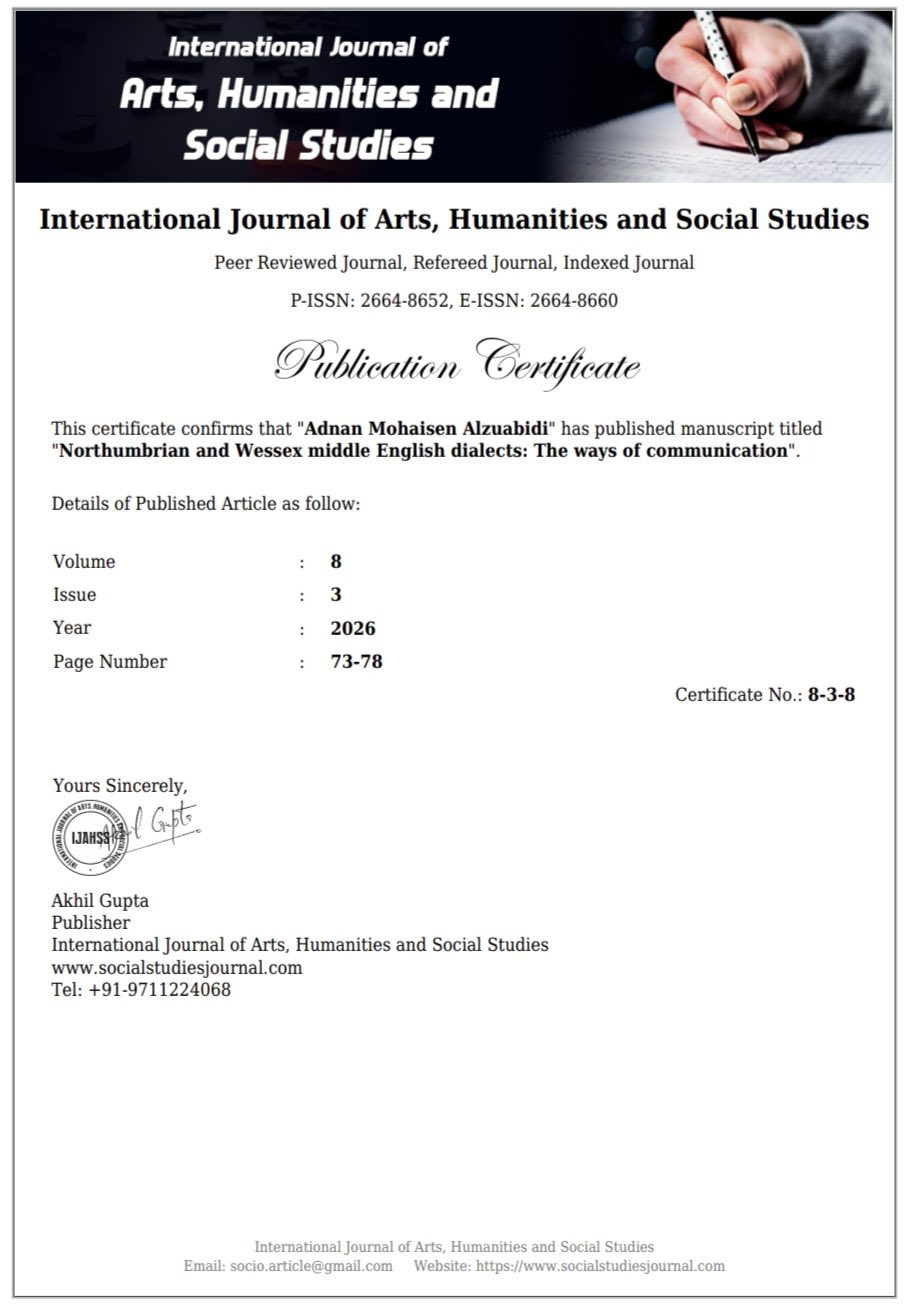 نشر المدرس الدكتور عدنان محسن علي، التدريسي في جامعة ميسان / كلية التربية الأساسية / قسم اللغة الإنجليزية، بحثاً علمياً في المجلة الدولية للفنون والعلوم الإنسانية والدراسات الاجتماعية، تناول فيه دراسة لغوية تاريخية مهمة.
