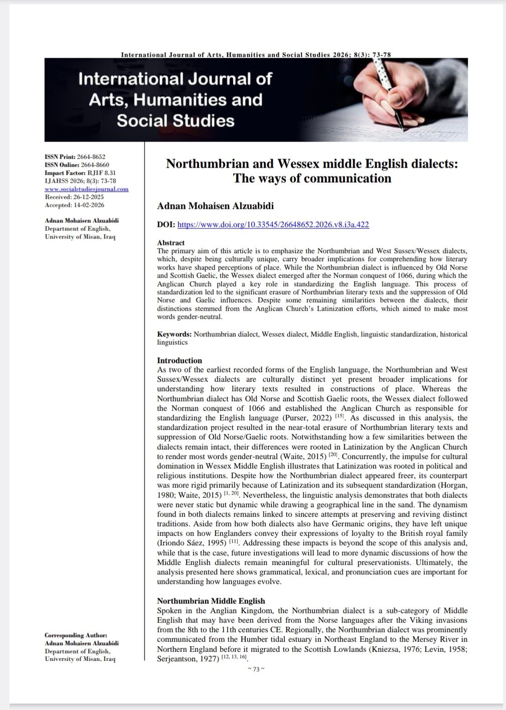 تدريسي من جامعة ميسان ينشر بحثاً حول تطور اللهجات في اللغة الإنجليزية الوسطى.