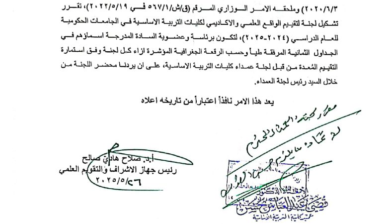 الأستاذ الدكتور عبدالكريم لازم بهير رئيساً للجنة تقييم الواقع العلمي والأكاديمي لكليات التربية الأساسية