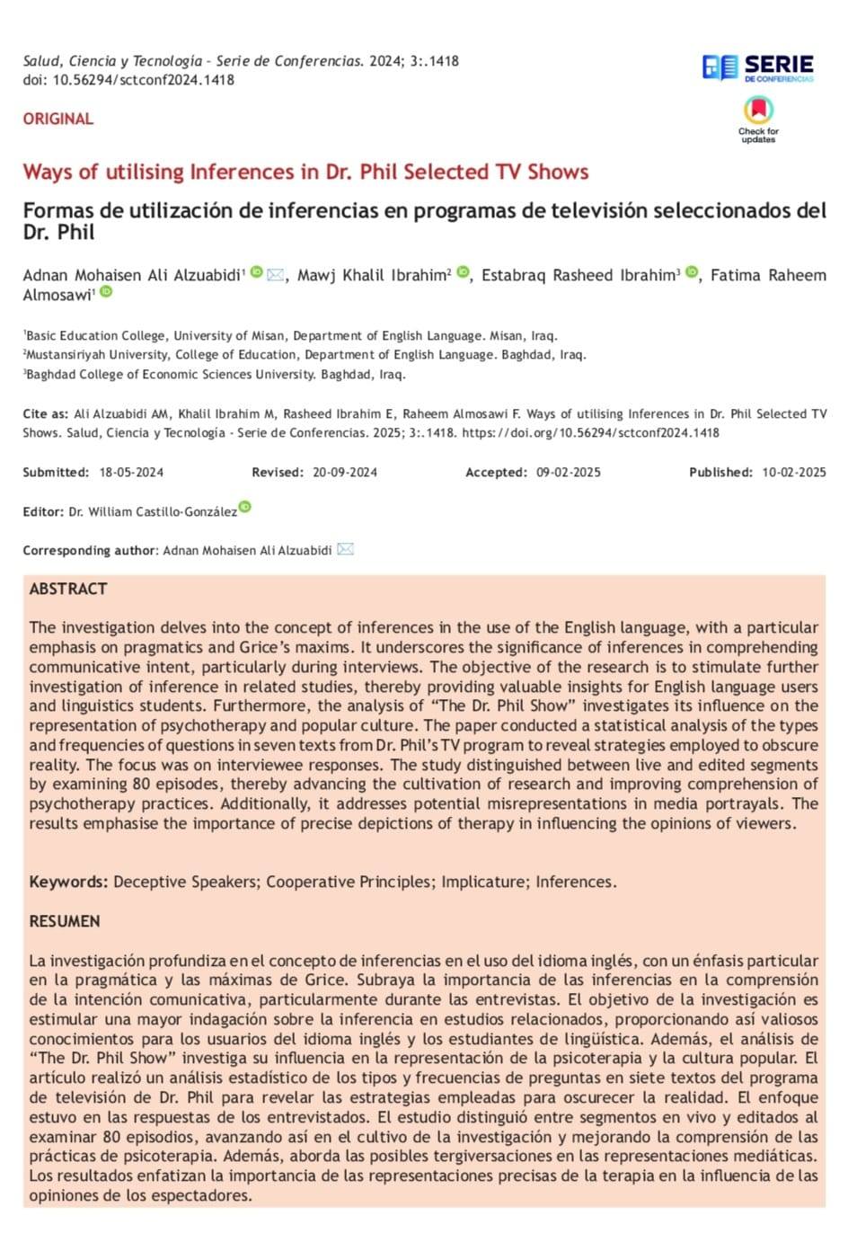 نشر (م . د عدنان محسن علي) و(أ.د فاطمة رحيم عبد الحسين) التدريسيين في قسم اللغة الإنكليزية بحثهما العلمي الموسوم ( أساليب توظيف الاستدلالات في برامج د. فيل التلفزيونية المختارة ) وذلك في مستوعبات سكوباس والمنشور باللغة الإنجليزية. تمنياتنا لهما بالتوفيق والسداد في مسيرتهما العلمية.