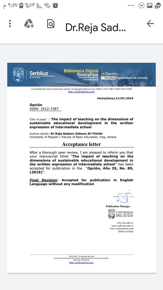 by Dr. Raja Sadoon, an instructor at department of First Classes/College of Basic Education, entitled (The impact of Teaching the Dimensions of Sustainable Educational Development in the Editorial Expression of the Secondary School Students. The Opcion journal is under Scopus coverage.