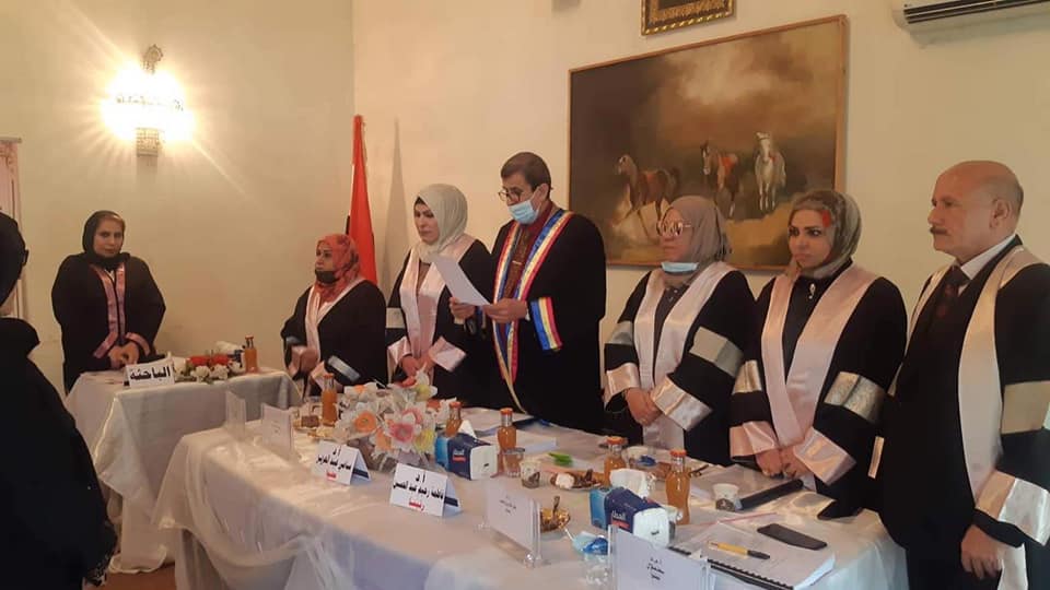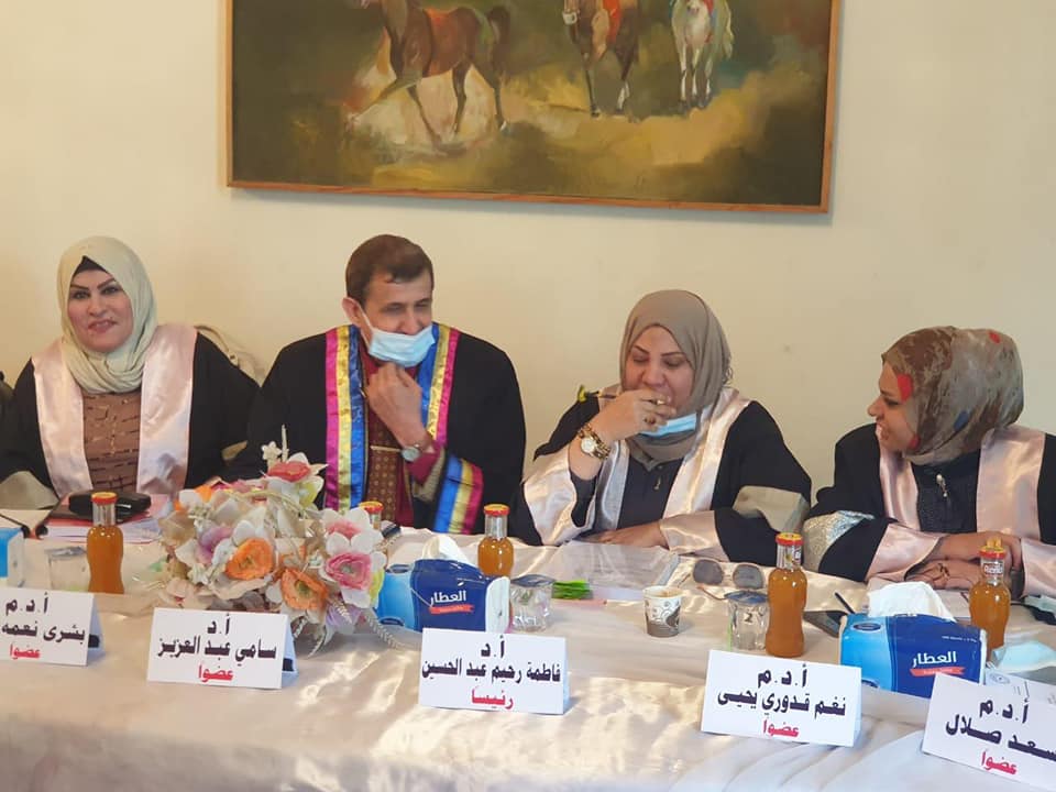 Prof. Fatima Rahim Abdel-Hussein / Teaching at the University of Maysan / Head of the English Language Department at the College of Basic Education chaired the committee for discussing the doctoral thesis of the student (Rajiha Abbas Sadaj) tagged (Achievement of Iraq ESL College Students Engaging in home-Assignments for developing (writing skills darning Lokdown) and Teachers Role)), which took place in the hall of the Arab Higher Institute for Educational and Psychological Studies .. where the committee included a group of professors and scholars in various Iraqi universities.