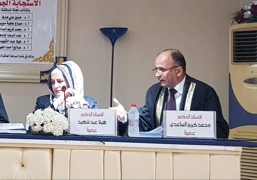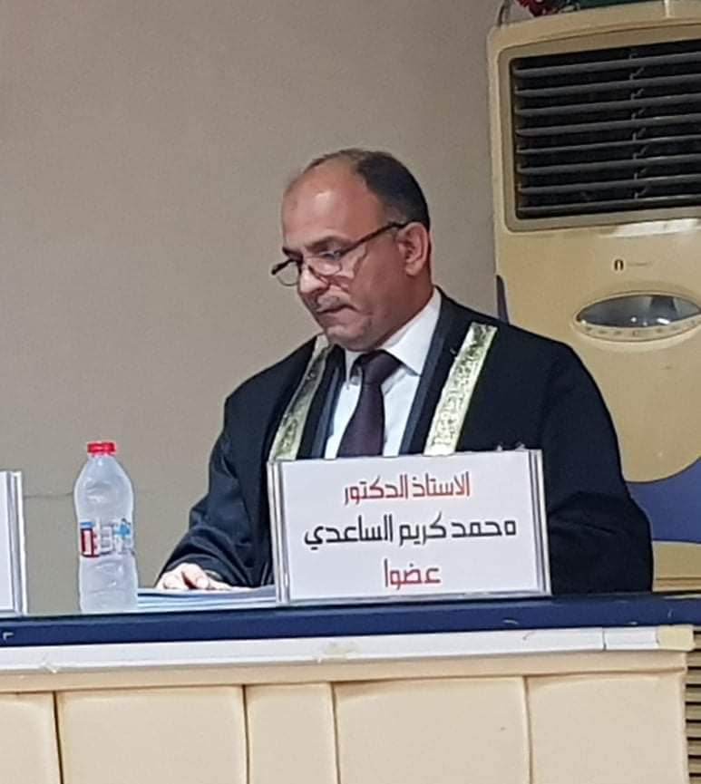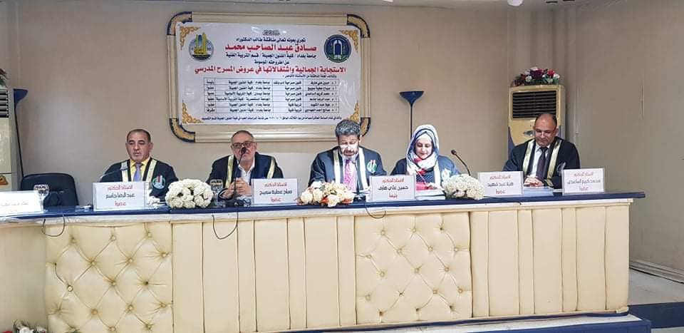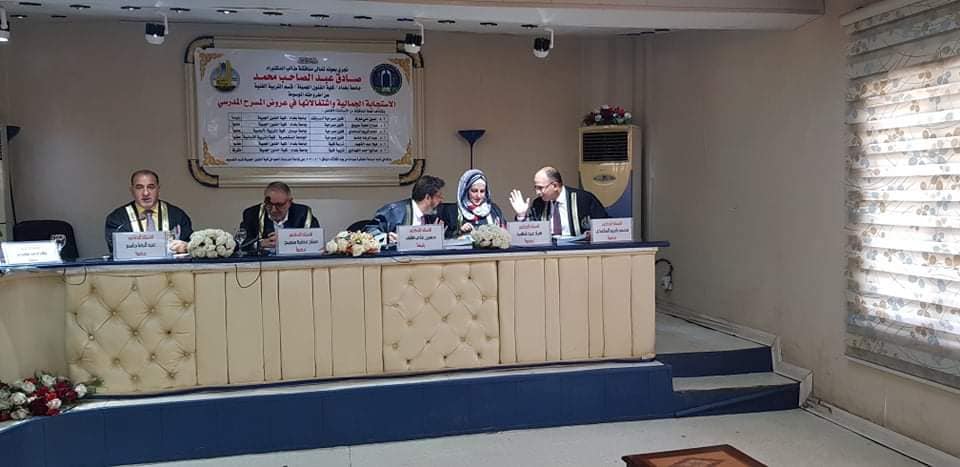 Prof. Muhammad Karim Khalaf, a teacher at the University of Maysan / College of Basic Education, participated in the discussion committee for the doctoral thesis of the student Sadiq Abdul-Sahib Muhammad and the tagged (Aesthetic response and its activities in school theater performances) within a group of Iraqi university professors, which took place in the campus of Baghdad University / College of Fine Arts / Graduate Studies Hall / Theater Arts Department.