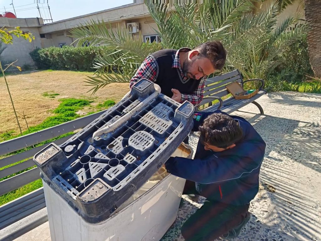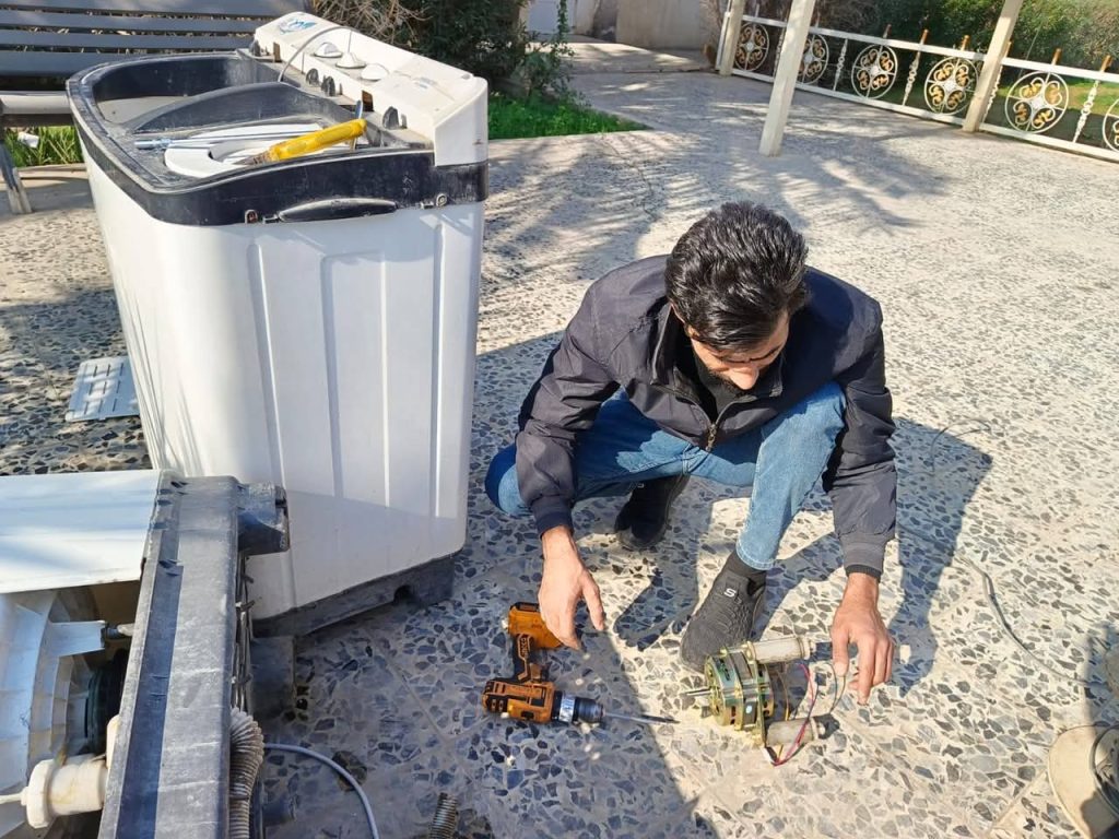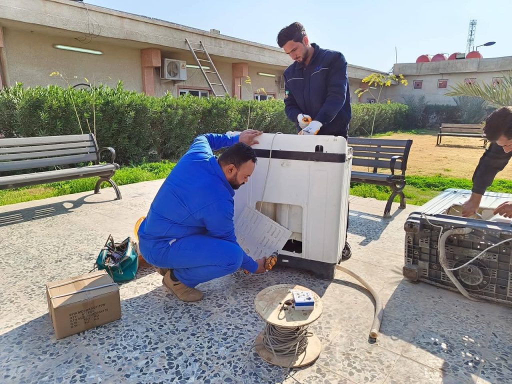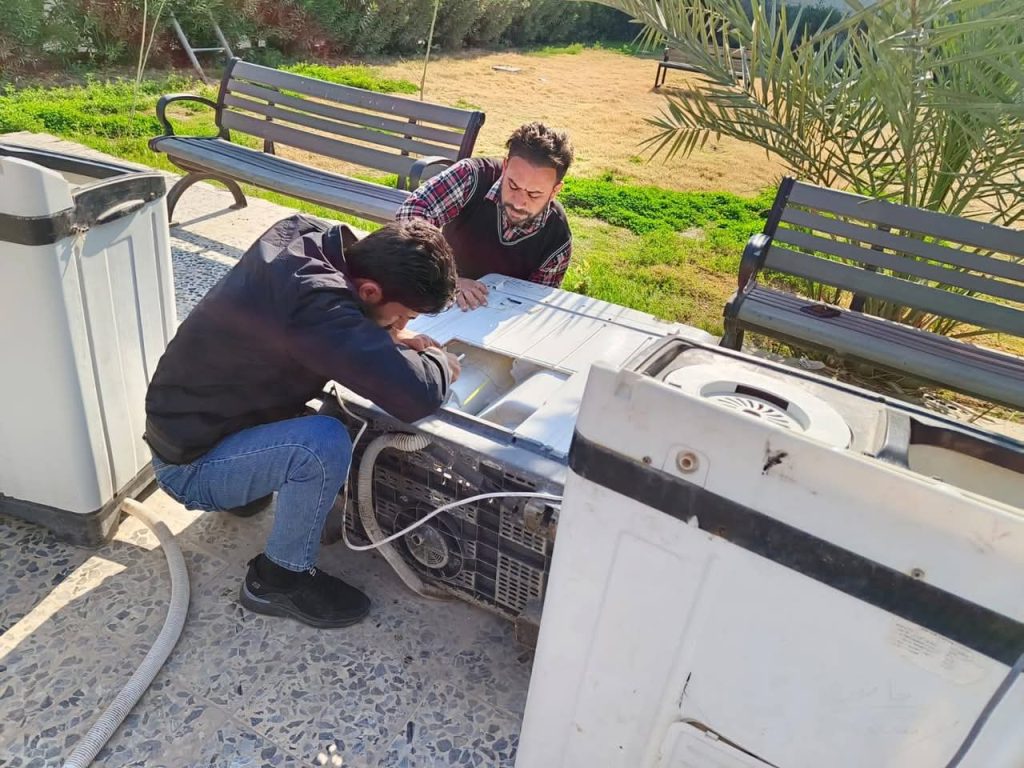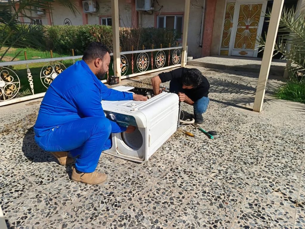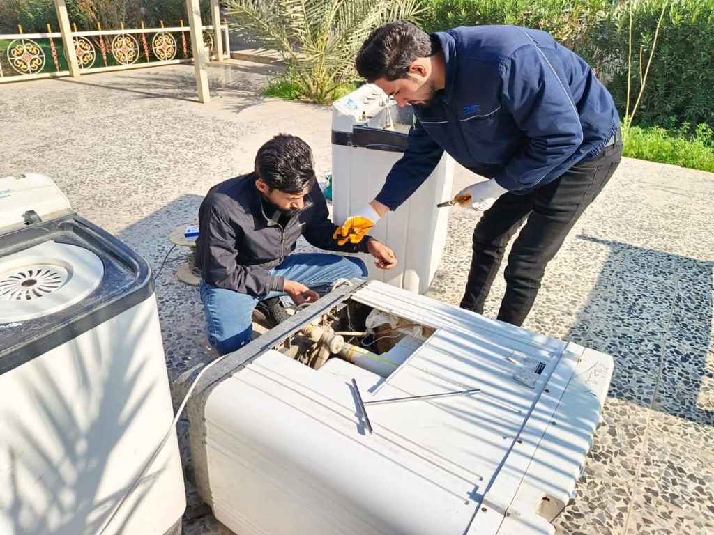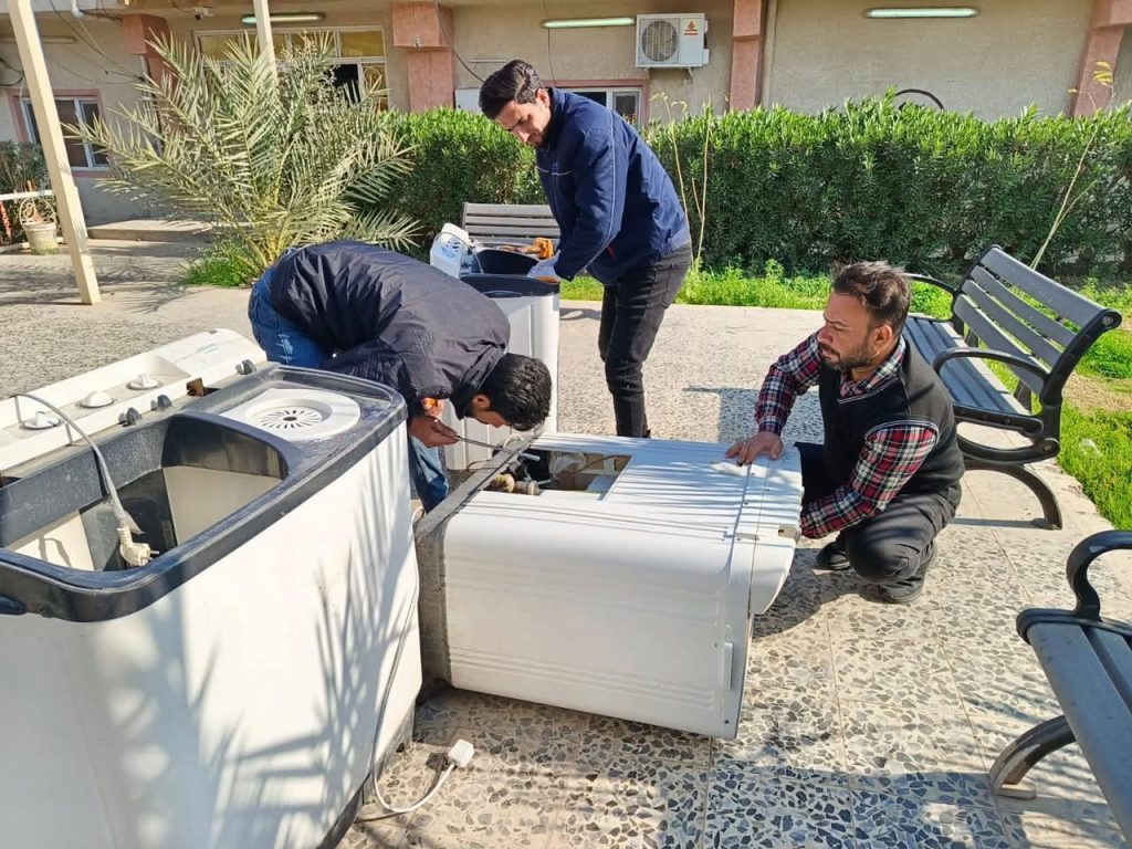 ملاكات شعبة الصيانة تقوم بصيانة الغسالات في مجمع الأبحاث لخدمة الطلبة
