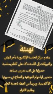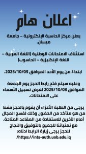 يعلن مركز الحاسبة في جامعة ميسان عن بدء دورات الكفاءة للمتقدمين على الدراسات العليا داخل العراق للعام2023-2024م للحاسبات واللغة العربية واختبار الوطني الموحد للغة الانكليزية من خلال الاستمارة ادناه: