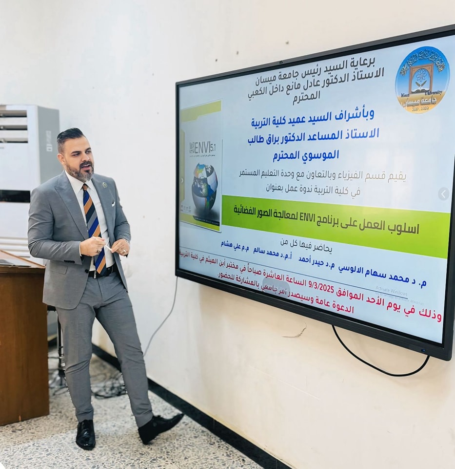نظم قسم الفيزياء بكلية التربية جامعة ميسان ندوة علمية حول برنامج ENVI ودوره في معالجة الصور الفضائية بحضور ومشاركة أساتذة القسم