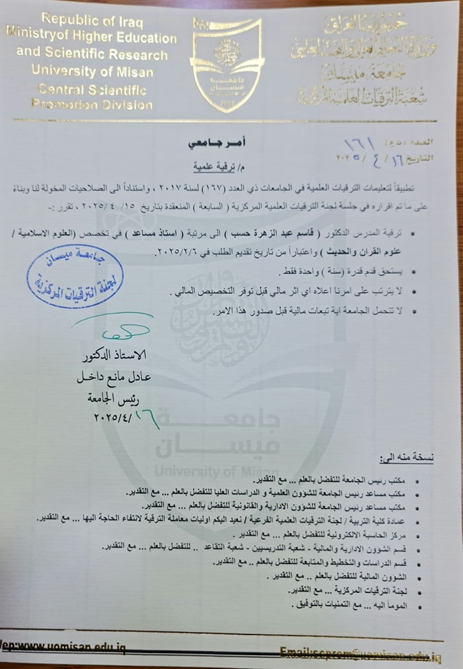 والتدريسي في قسم علوم القرآن والتربية الإسلامية بكلية التربية جامعة ميسان على الترقية العلمية ومنحه لقب ( استاذ مساعد),بعد استيفائه متطلبات الترقية المنصوص عليها في قانون الترقيات .جاء ذلك بعد أن عقدت لجنة الترقيات المركزية اجتماعها لإقرار أمر الترقية ، ومُنح اللقب العلمي من تاريخ تقديم الطلب ، وبهذا أصبح يتمتع بالحقوق والأمتيازات التي تخوله لممارسة الصلاحيات العلمية.