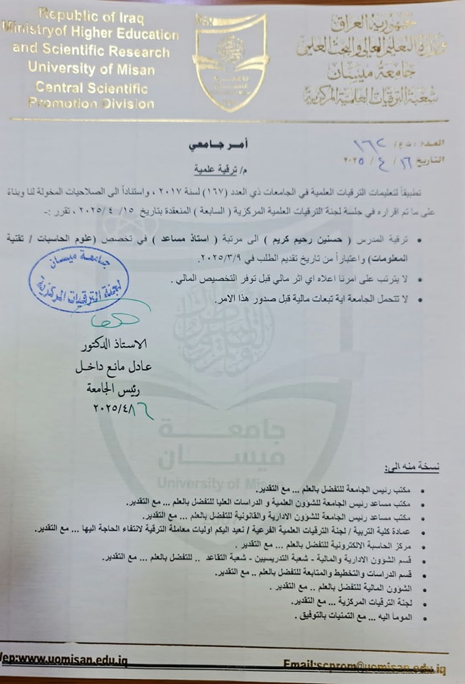 والتدريسي في قسم الحاسبات بكلية التربية جامعة ميسان على الترقية العلمية ومنحه لقب ( استاذ مساعد),بعد استيفائه متطلبات الترقية المنصوص عليها في قانون الترقيات .جاء ذلك بعد أن عقدت لجنة الترقيات المركزية اجتماعها لإقرار أمر الترقية ، ومُنح اللقب العلمي من تاريخ تقديم الطلب ، وبهذا أصبح يتمتع بالحقوق والأمتيازات التي تخوله لممارسة الصلاحيات العلمية.