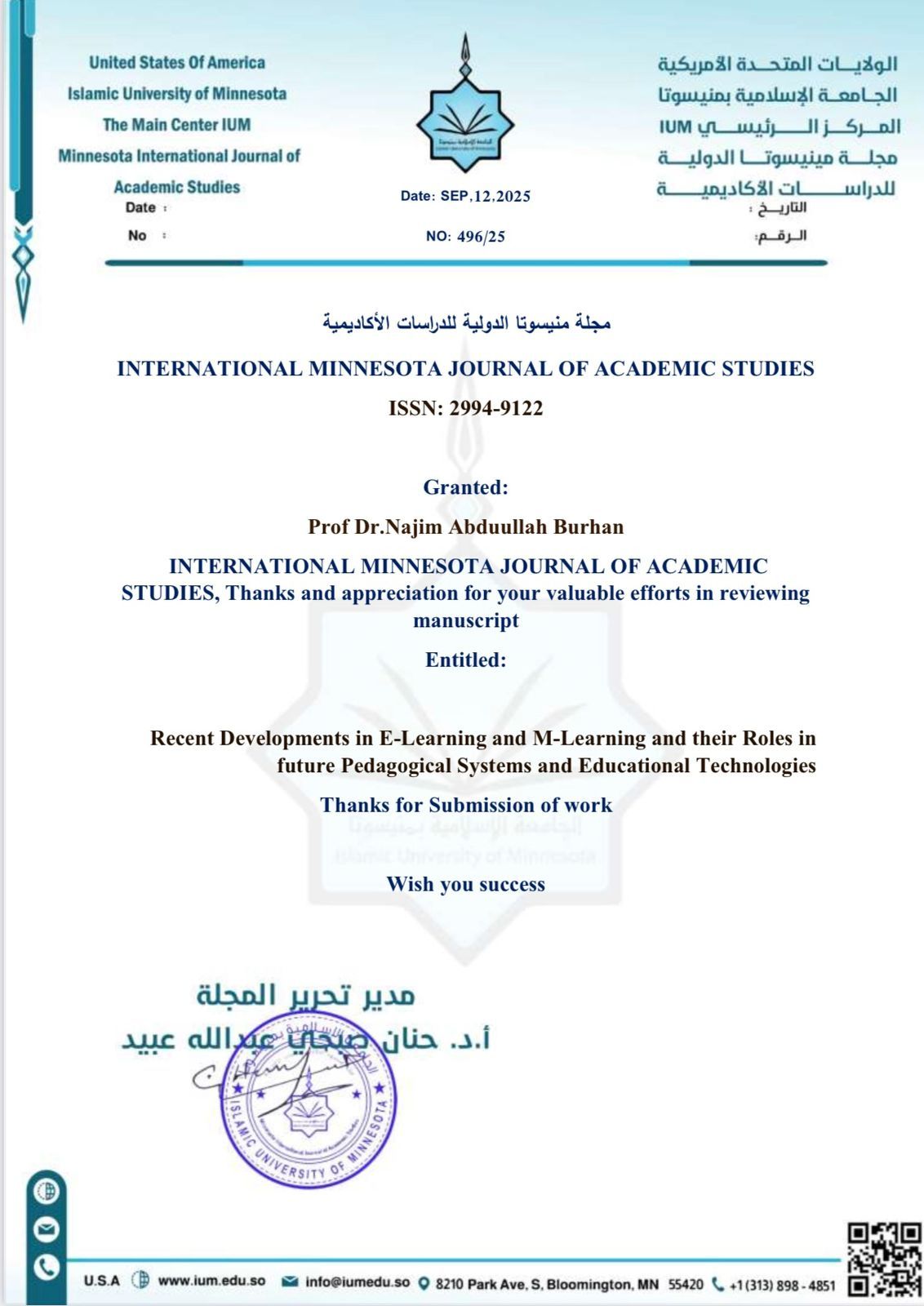تدريسي في كلية التربية مقيماً علمياً لبحث في مجلة منيسوتا الدولية للدراسات الاكاديمية في الولايات المتحدة الأمريكية