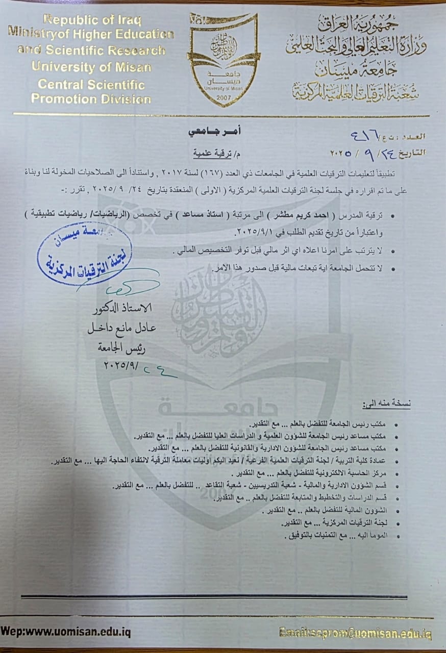 (احمد كريم مطشر) رئيس قسم الرياضيات بكلية التربية جامعة ميسان على الترقية العلمية ومنحه لقب ( استاذ مساعد) في تخصص ( الرياضيات التطبيقية) ,بعد استيفائه متطلبات الترقية المنصوص عليها في قانون الترقيات .