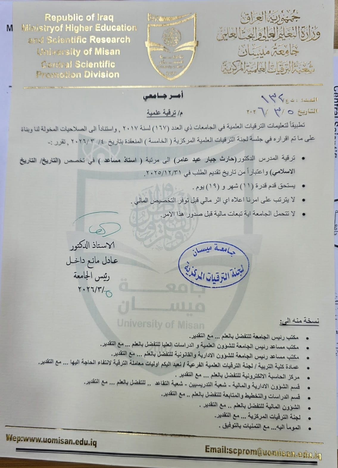 جاء ذلك بعد أن عقدت لجنة الترقيات المركزية اجتماعها لإقرار أمر الترقية ، ومُنحه اللقب العلمي من تاريخ تقديم الطلب ، وبهذا أصبح يتمتع بالحقوق والأمتيازات التي تخوله لممارسة الصلاحيات العلمية .