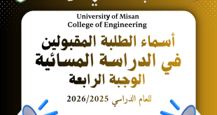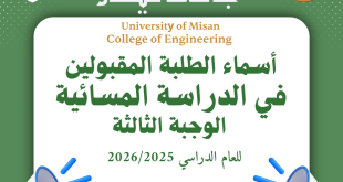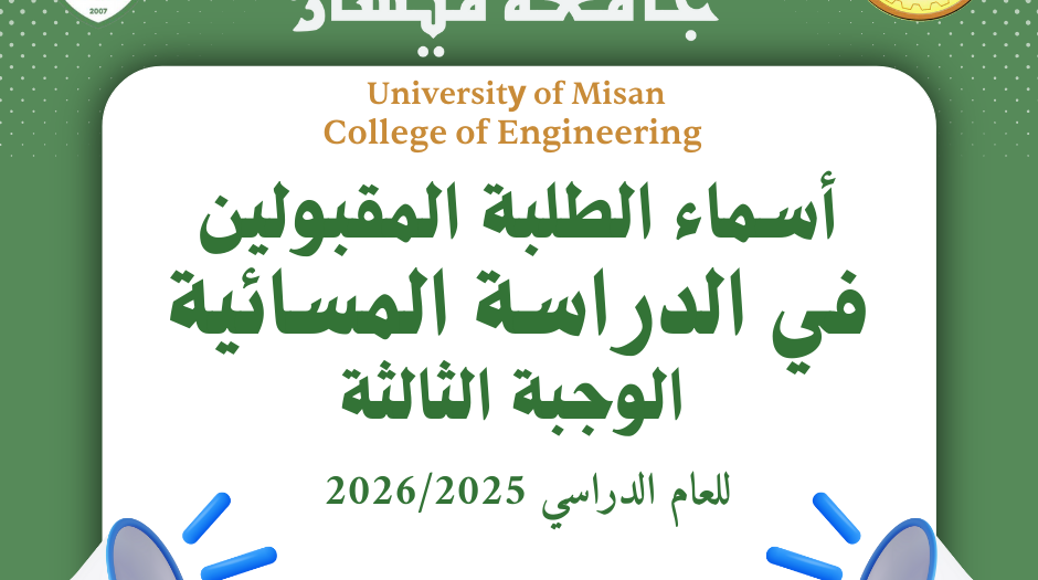 تعلن كلية الهندسة عن أسماء الطلبة المقبولين للدراسة المسائية (الوجبة الثالثة ) وكذلك أبناء الأساتذة (الوجبة الثانية) للعام الدراسي 2025-2026.