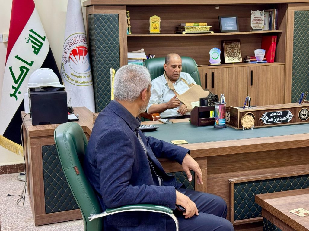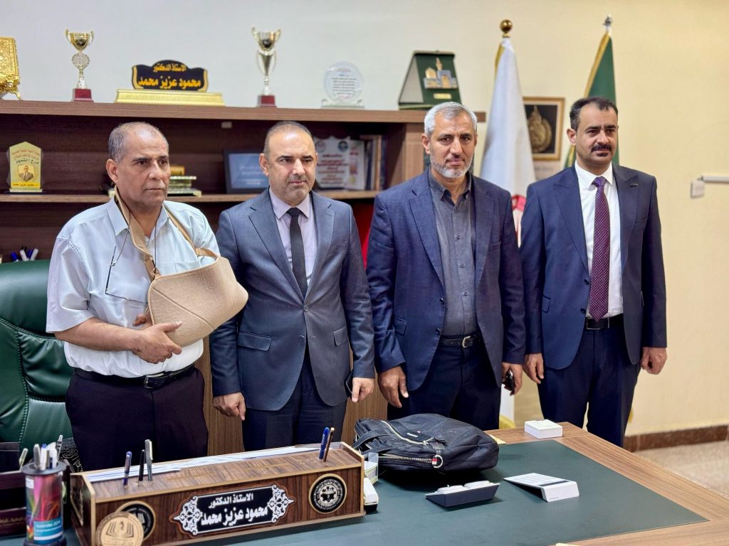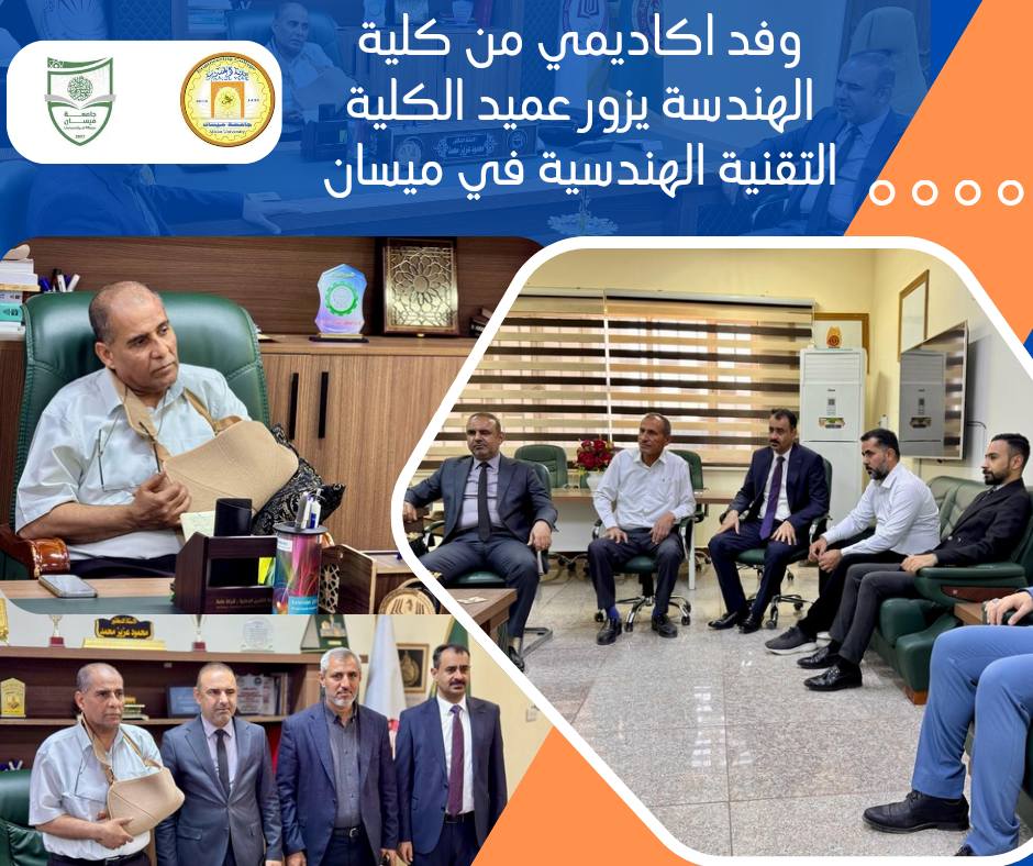 زار السيد عميد كلية الهندسة، الأستاذ الدكتور عباس عودة داود، يرافقه وفد من كلية الهندسة ضم الاستاذ الدكتور احمد كاظم الشرع والدكتور محمود شاكر محمود رئيس قسم الهندسة الميكانيكية، عمادة الكلية التقنية الهندسية في ميسان، ولقاء السيد عميد الكلية الأستاذ الدكتور محمود عزيز، في مكتبه، وذلك بعد مباشرته بالدوام عقب الحادث المروري المؤسف الذي تعرض له مع عائلته.