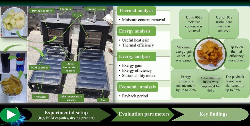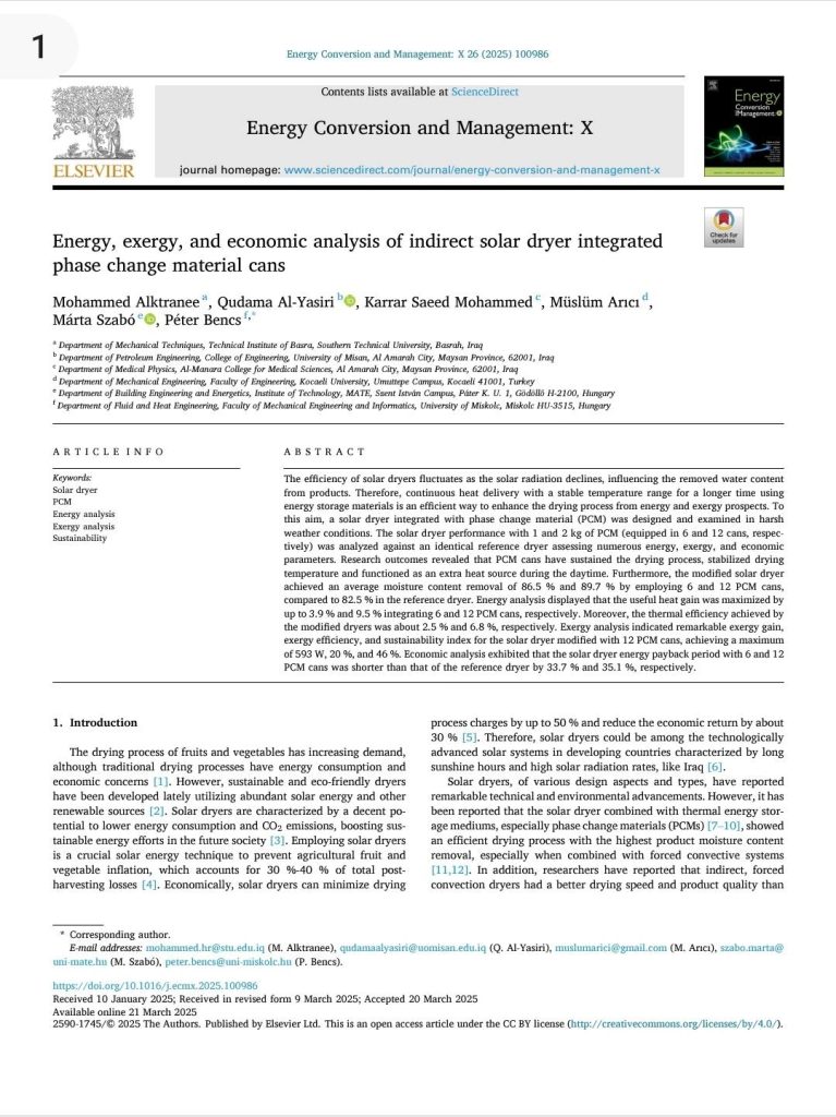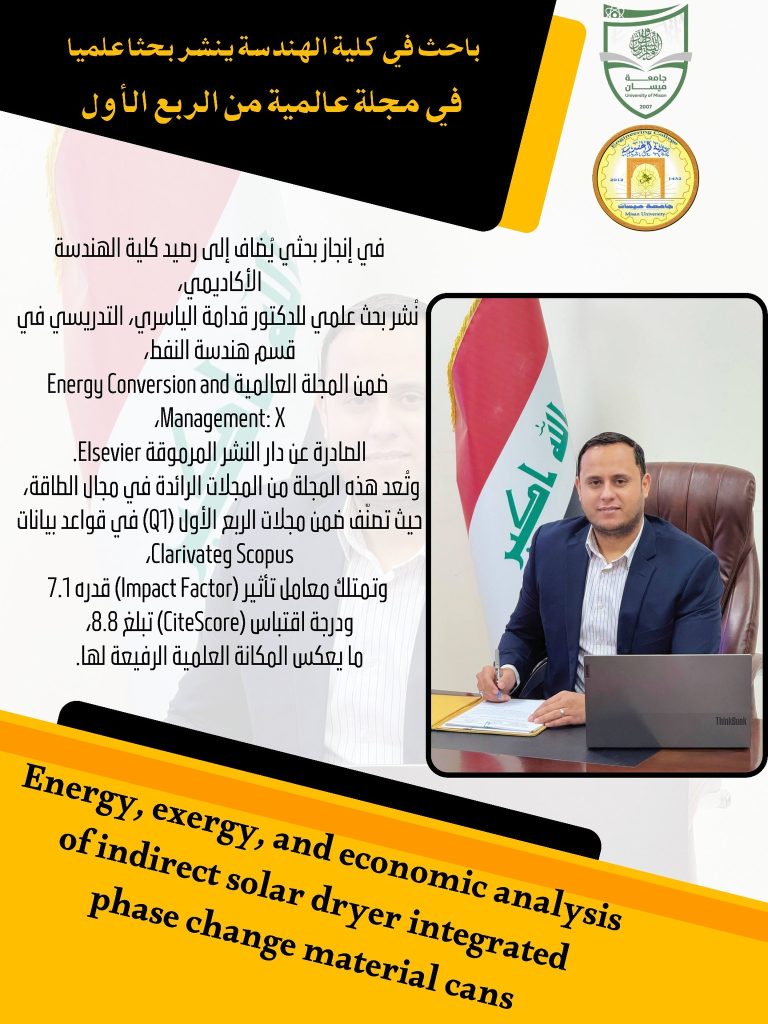 تناول دراسة تصميم عملي لمجفف شمسي غير مباشر مطوّر، يستند إلى استخدام مواد متغيرة الطور (Phase Change Materials – PCM) بوزنين مختلفين (1 و2 كغم)، تم حقنها داخل علب مشروبات غازية معاد تدويرها، كوسيلة لتخزين الطاقة الحرارية وتحسين أداء التجفيف.وقد تم اختبار النظام المطوّر ميدانياً في بيئة مناخية قاسية تمثلت بصيف العراق، لاختبار فعاليته في تجفيف شرائح البطيخ. وأظهرت النتائج أن إضافة مادة PCM ساهمت بشكل ملحوظ في إطالة فترة التجفيف، واستقرار درجة حرارة المجفف، وتوفير مصدر حراري مستدام خلال فترات انقطاع الإشعاع الشمسي، وهو ما يُعد تطوراً مهماً في تقنيات التجفيف الحراري الصديقة للبيئة.وبيّنت نتائج التجربة أن معدل إزالة الرطوبة من شرائح البطيخ بلغ 86.5٪ و89.7٪ باستخدام 1 و2 كغم من مادة PCM، مقارنة بـ82.5٪ في المجفف المرجعي، كما حقق المجفف المطوّر كفاءة حرارية بنسبة 2.5٪ و6.8٪ على التوالي. ومن الجانب الاقتصادي، أظهر التحليل أن فترة استرداد الطاقة للمجفف المزود بمادة PCM كانت أقصر بنسبة 33.7٪ و35.1٪ مقارنةً بالمجفف التقليدي، ما يعزز من جدوى استخدام هذا النظام في التطبيقات الزراعية المستدامة.تجدر الإشارة إلى أن البحث أُنجز بالتعاون مع فريق بحثي مشترك من العراق و هنغاريا وتركيا، مما يعكس الطابع الدولي للمشروع وأهمية التعاون البحثي في تطوير الحلول العلمية ذات الأثر التطبيقي.