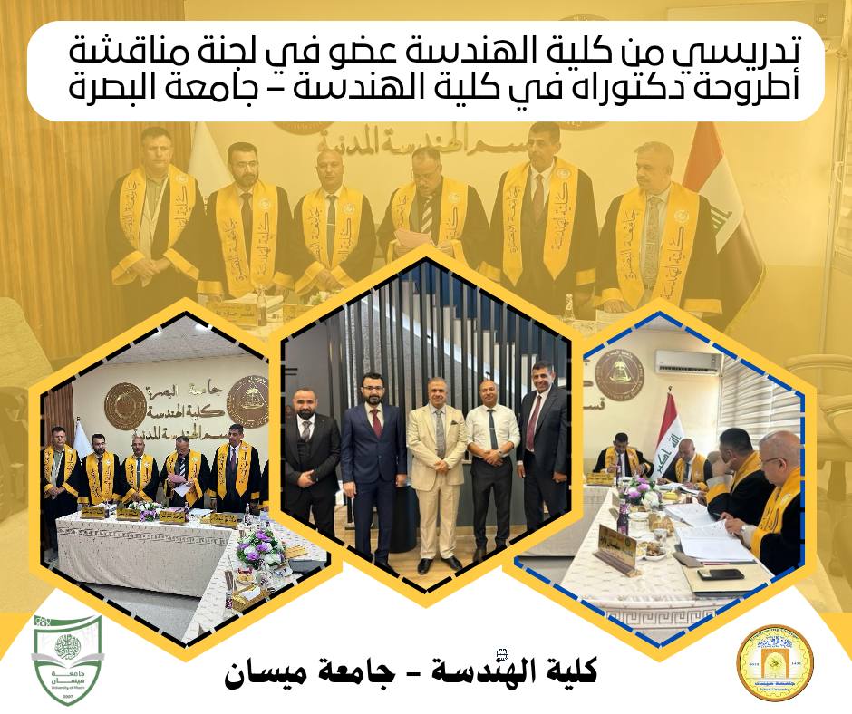 في إطار تعزيز التعاون العلمي والأكاديمي بين الجامعات العراقية، شارك الأستاذ المساعد الدكتور معمر حازم علي، التدريسي في كلية الهندسة – جامعة ميسان، في عضوية لجنة مناقشة أطروحة الدكتوراه الموسومة: