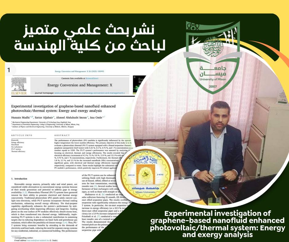 ضمن سلسلة النجاحات العلمية المتواصلة في كلية الهندسة، سجّل المدرس المساعد حسين ماضي حمد البهادلي، التدريسي في قسم هندسة النفط، إنجازًا بحثيًا مميزًا بنشره بحثا علميا بعنوان: