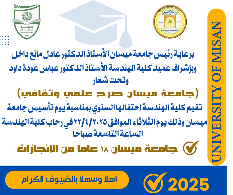 برعاية السيد رئيس جامعة ميسان الأستاذ الدكتور عادل مانع داخل، وبإشراف عميد كلية الهندسة الأستاذ الدكتور عباس عودة داود، وبمناسبة الذكرى السنوية الـ18 لتأسيس جامعة ميسان، تقيم كلية الهندسة احتفاليتها السنوية تحت شعار: