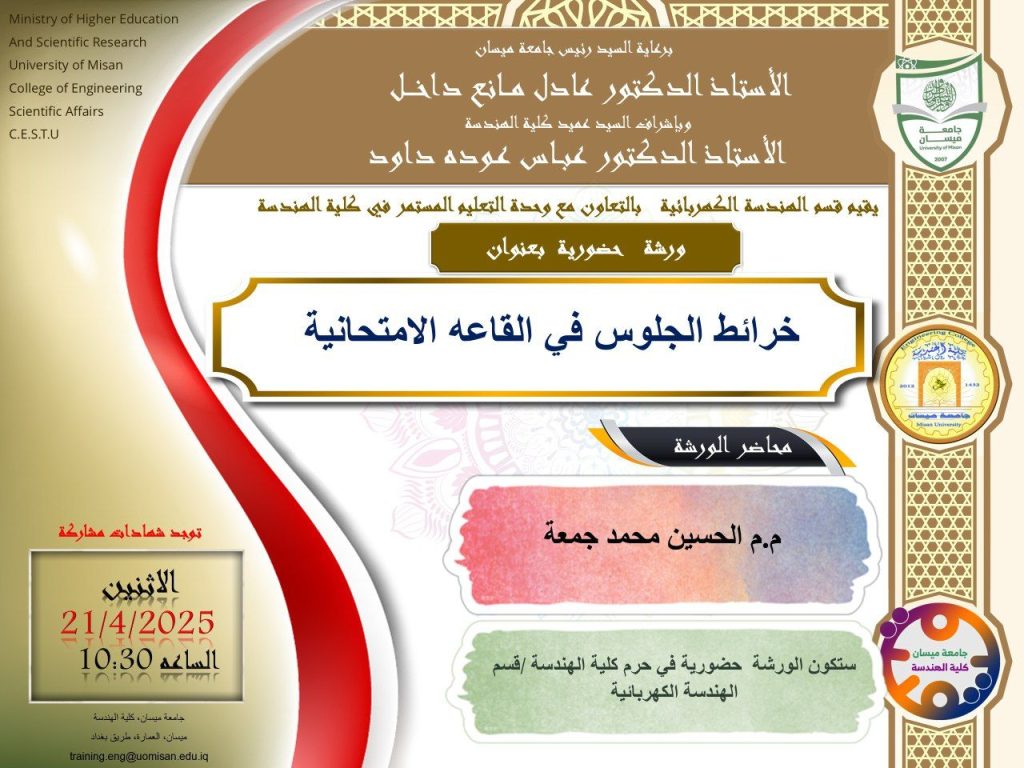 برعاية السيد رئيس جامعة ميسان الاستاذ الدكتور عادل مانع داخل، وباشراف السيد عميد كلية الهندسة الاستاذ الدكتور عباس عودة داود، تقيم وحدة التعليم المستمر في كلية الهندسة، بالتعاون مع قسم الهندسة الكهربائية، ورشة حضورية بعنوان: