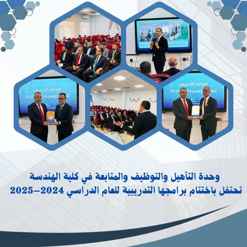 برعاية الأستاذ الدكتور عادل مانع داخل، رئيس جامعة ميسان المحترم، وبإشراف الأستاذ الدكتور عباس عودة داود، عميد كلية الهندسة، أقامت كلية الهندسة في جامعة ميسان حفلاً لاختتام البرامج التدريبية الخاصة بالطلبة والخريجين للعام الدراسي 2024–2025، والتي نظّمتها وحدة التأهيل والتوظيف والمتابعة في الكلية.