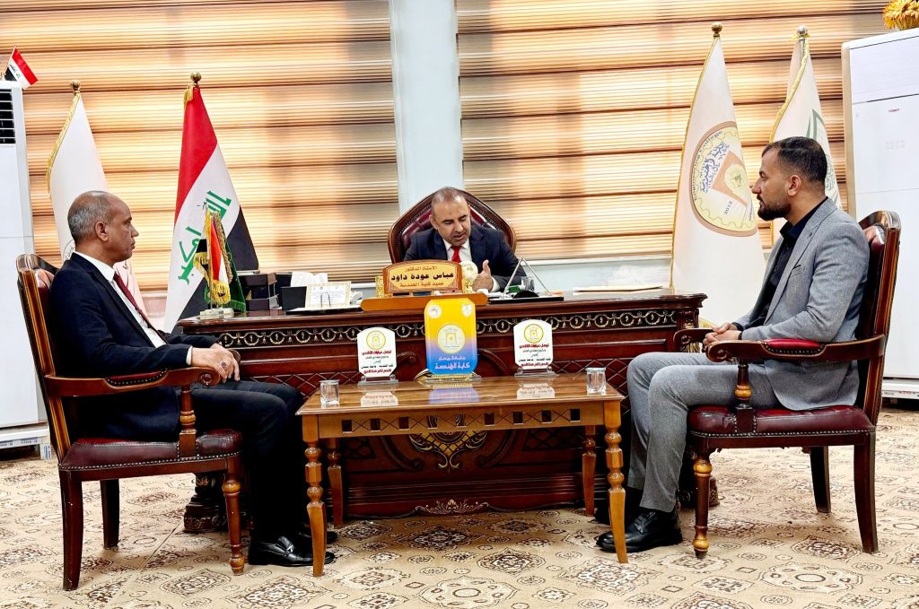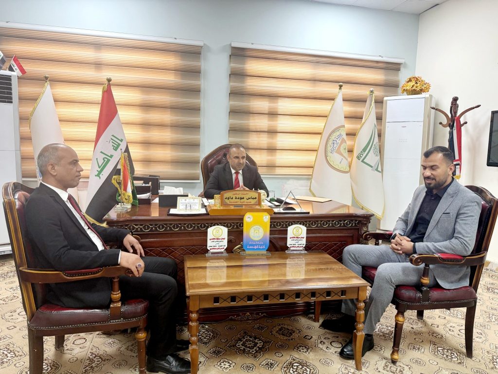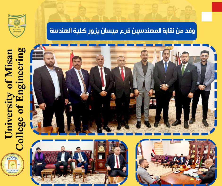 استقبل الأستاذ الدكتور عباس عودة داود، عميد كلية الهندسة، وفدًا من نقابة المهندسين – فرع ميسان، وذلك في إطار تعزيز التعاون المشترك بين الطرفين بما يخدم المسيرة العلمية والمهنية.