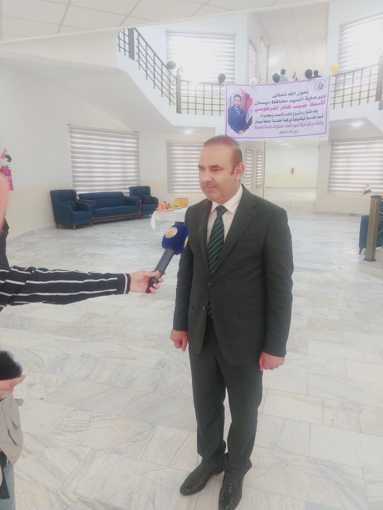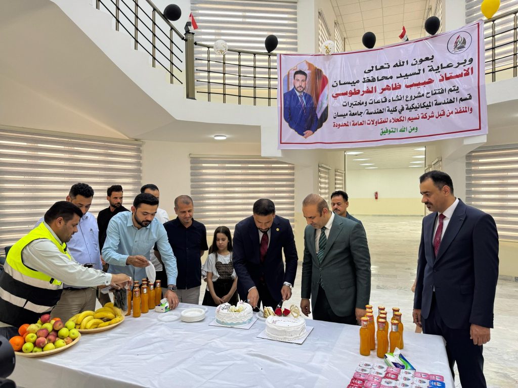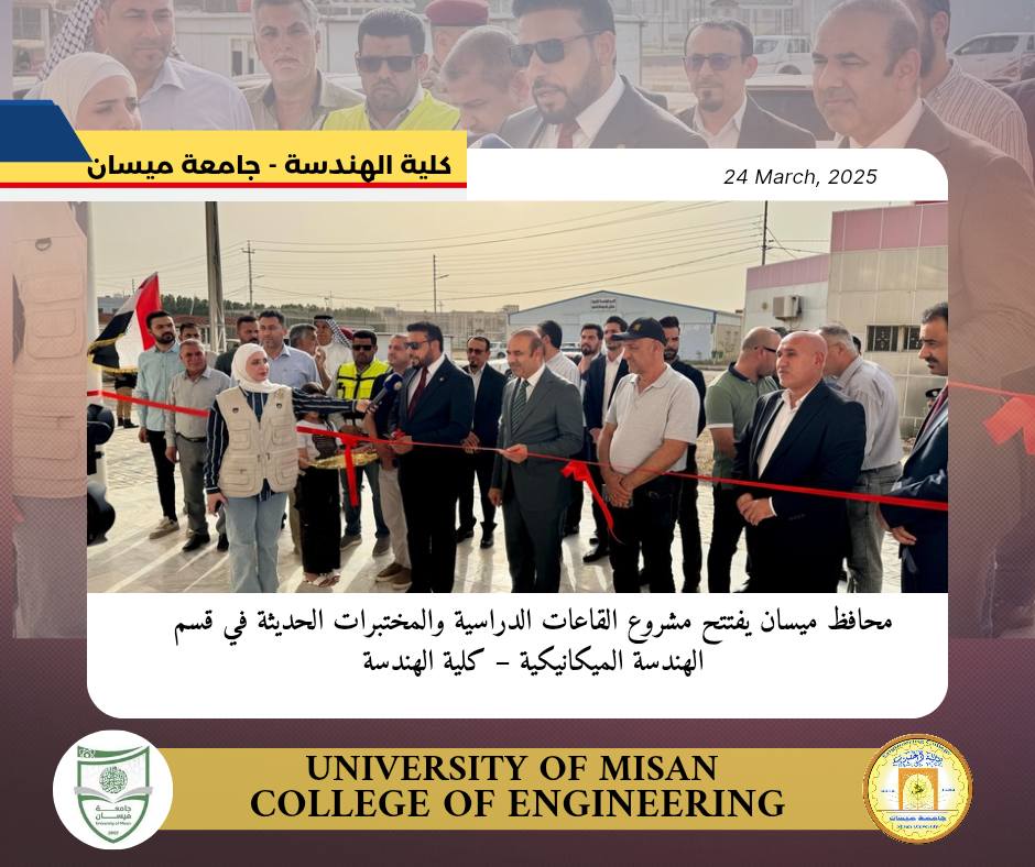 افتتح السيد محافظ ميسان الأستاذ حبيب ظاهر الفرطوسي بحضور السيد عميد كلية الهندسة الاستاذ الدكتور عباس عودة داود، مشروع إنشاء قاعات ومختبرات قسم الهندسة الميكانيكية – كلية الهندسة، وذلك ضمن تخصيصات محافظة ميسان والتي تعكس خطط المحافظة بدعم وتطوير قطاع التعليم العالي وتعزيز البنى التحتية الجامعية. وشهد حفل الافتتاح حضور المهندس ماجد جعفر معاون المحافظ للشؤون الفنية، والمهندس إيهاب عادل مدير قسم إدارة المشاريع، والسيد المعاون الإداري للعميد والسادة رؤساء الأقسام العلمية، ومجموعة من الكادر التدريسي والوظيفي في كلية الهندسة، إلى جانب كل من والمهندس غسان فالح حسن رئيس دائرة المهندس المقيم، والمهندسة آية جبار، فضلًا عن لجنة الإشراف والمتابعة.