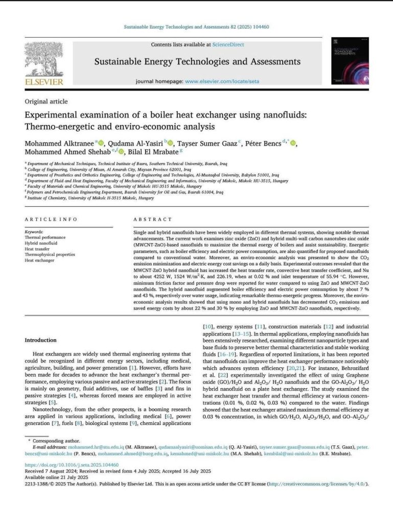 في مجلة Sustainable Energy Technologies and Assessments الصادرة عن دار النشر العالمية Elsevier، والتي تُعد من المجلات العلمية الرصينة ضمن الربع الأول (Q1)، حيث تمتلك معامل تأثير (Impact Factor) قدره 7 ودرجة اقتباس (CiteScore) تبلغ 17.3.