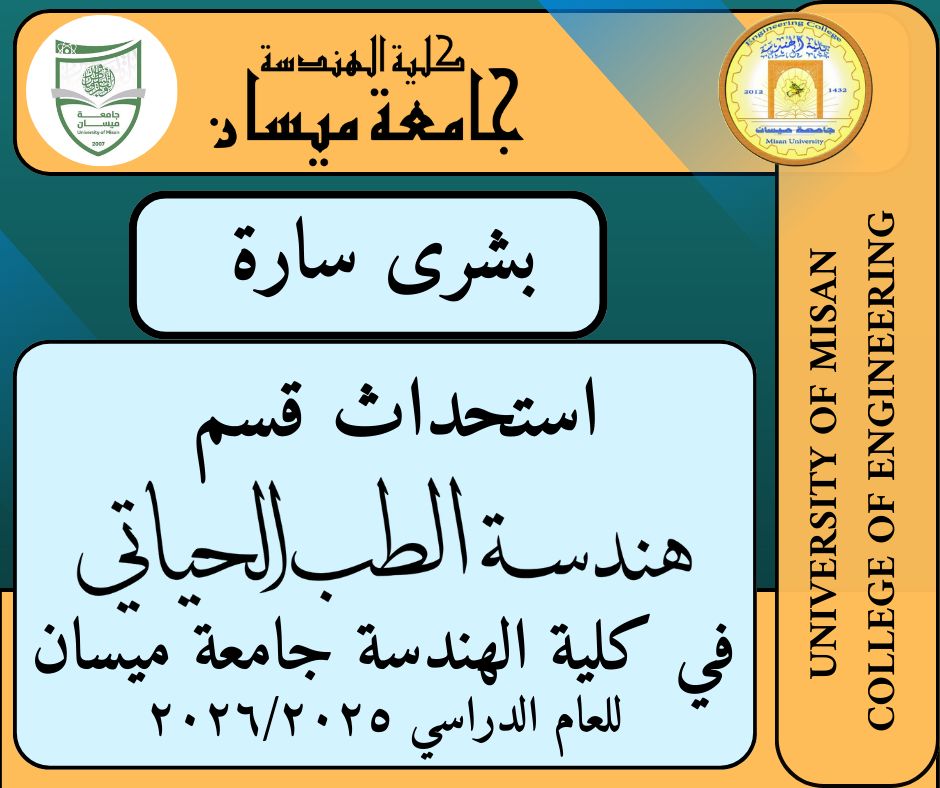 في إطار السعي المستمر لتطوير المسيرة الأكاديمية وتعزيز التخصصات العلمية الحديثة، حصلت كلية الهندسة – جامعة ميسان على الموافقة الرسمية من وزارة التعليم العالي والبحث العلمي لاستحداث قسم هندسة الطب الحياتي ابتداءً من العام الدراسي (2025-2026).