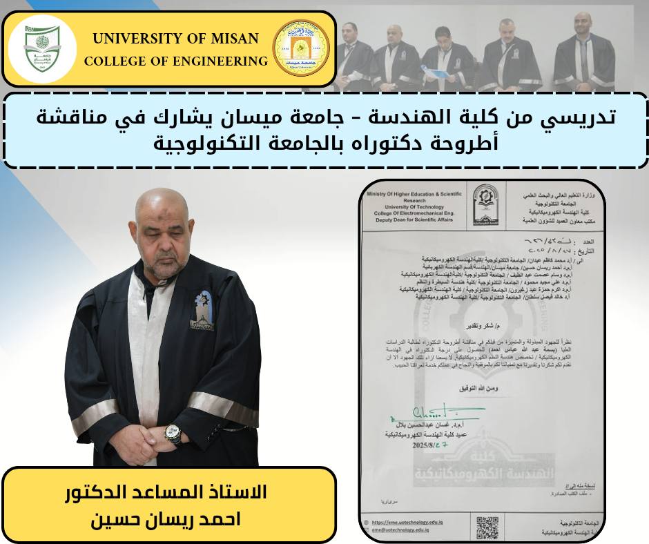 شارك الأستاذ المساعد الدكتور أحمد ريسان حسين التدريسي في كلية الهندسة – جامعة ميسان، بعضوية لجنة مناقشة أطروحة الدكتوراه للباحثة بسمة عبد الله عباس في الجامعة التكنولوجية / كلية الهندسة الكهروميكانيكية، والموسومة: