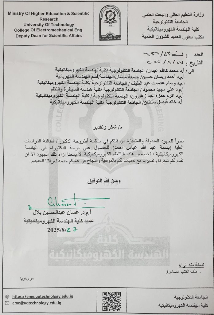 وفي ختام جلسة المناقشة، تم تقديم كتب شكر وتقدير إلى الدكتور أحمد ريسان حسين وأعضاء ورئيس لجنة المناقشة، من قبل عميد كلية الهندسة الكهروميكانيكية، الاستاذ الدكتور غسان عبد الحسين بلال، تثميناً لجهودهم العلمية المبذولة في تقييم ومناقشة أطروحة الدكتوراه اعلاه..