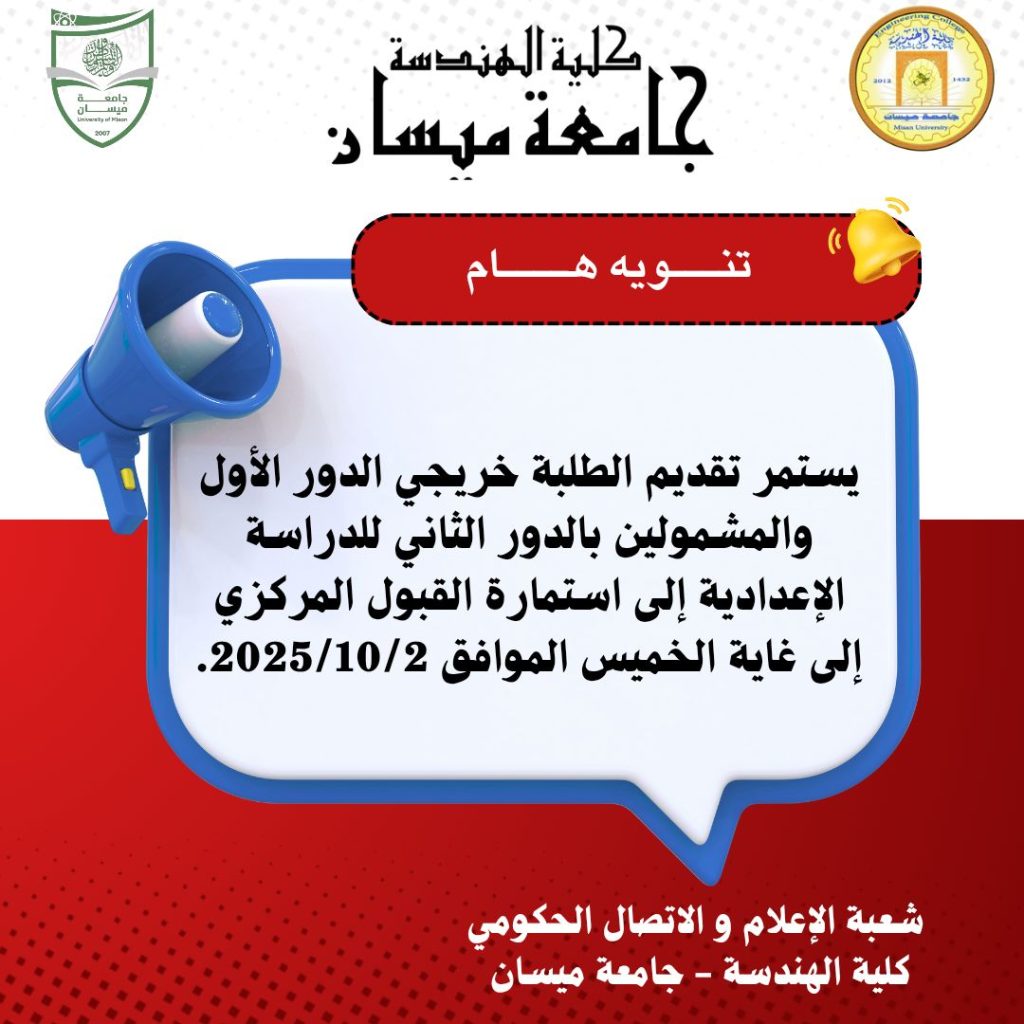 تحديث مهم 2025-09-01 أخبار الكلية, أنشطة الكلية, اعلانات هامة 177 زيارة عدد الزيارات: 178 شاركها Facebook Twitter LinkedIn