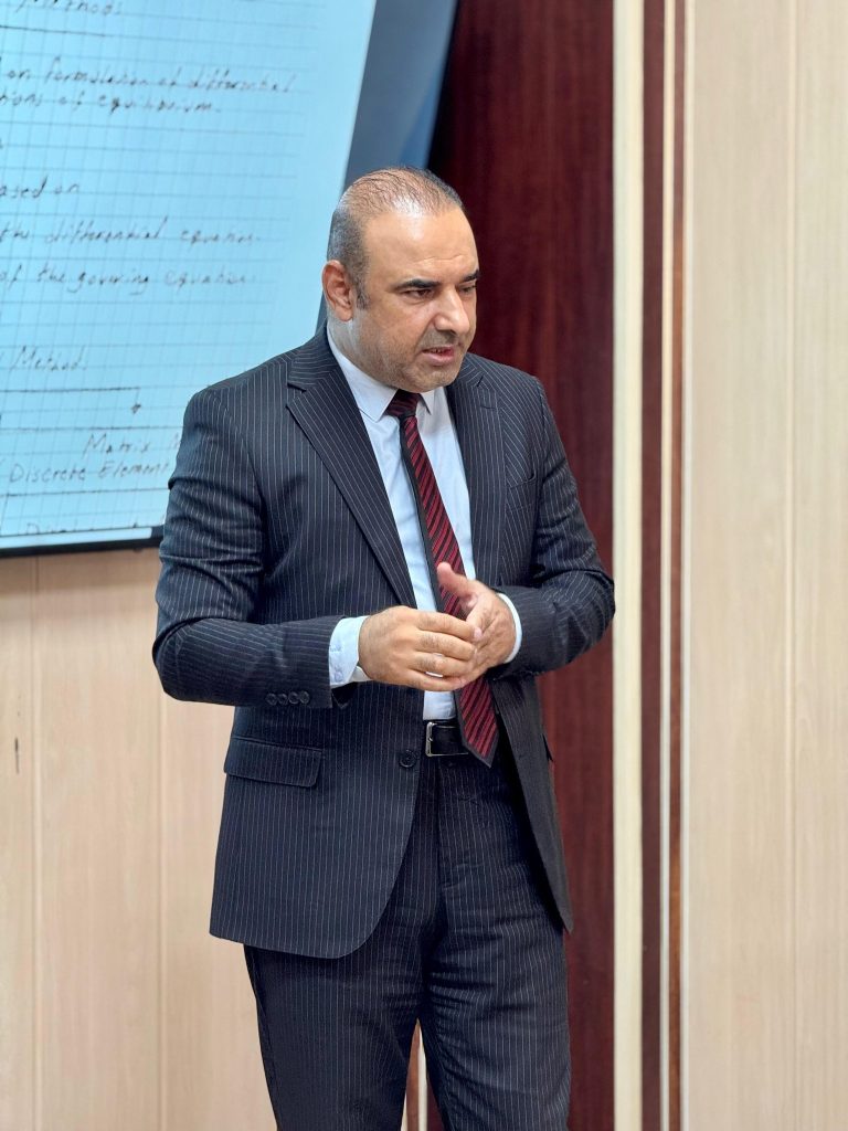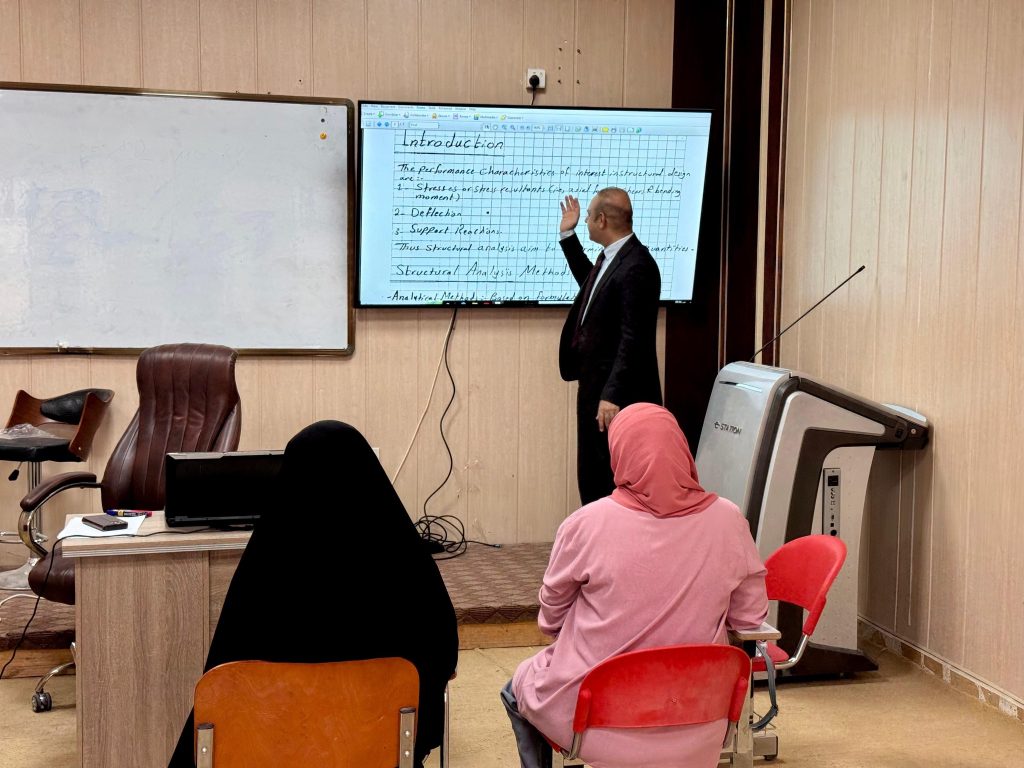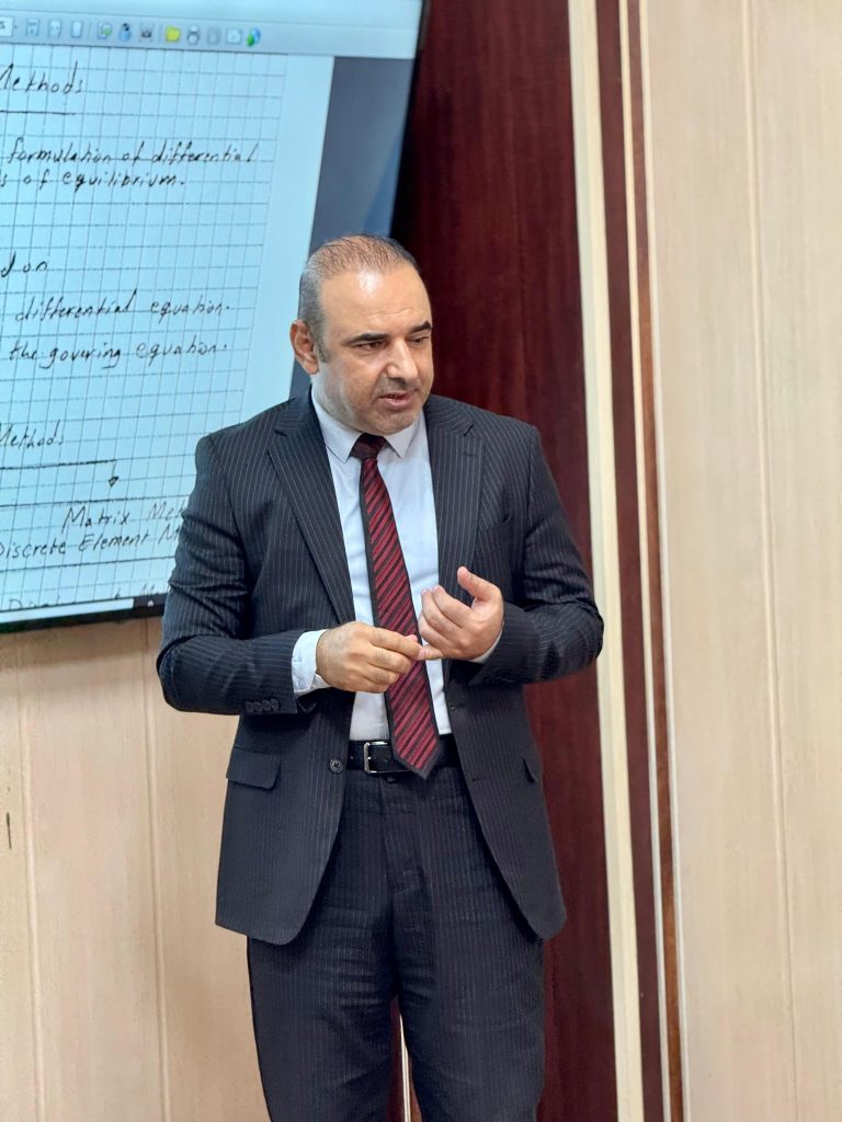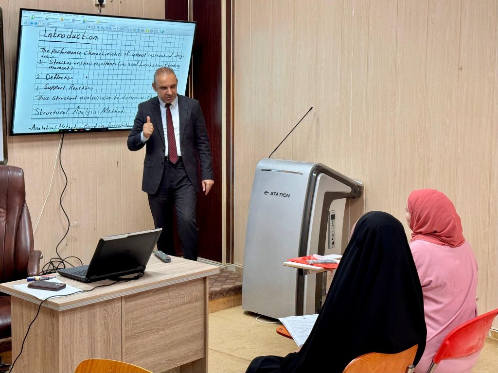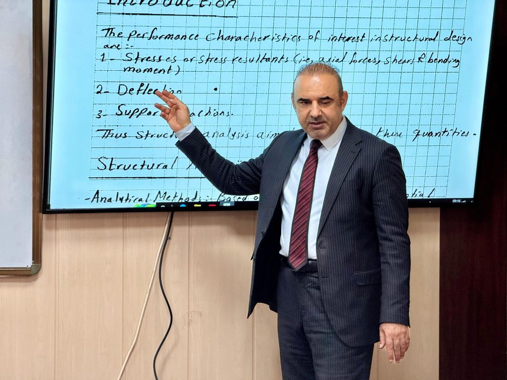 وقد افتتح السيد عميد الكلية الأستاذ الدكتور عباس عوده داود العام الدراسي بمحاضرته في مادة Advanced Structural Analysis لطلبة الماجستير في قسم الهندسة المدنية، مؤكداً في مستهل حديثه على أهمية الالتزام بالجدية العلمية والبحثية، والعمل على تقديم دراسات رصينة تسهم في خدمة المجتمع وتعزيز مكانة الكلية والجامعة في المحافل الأكاديمية.