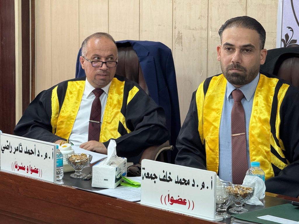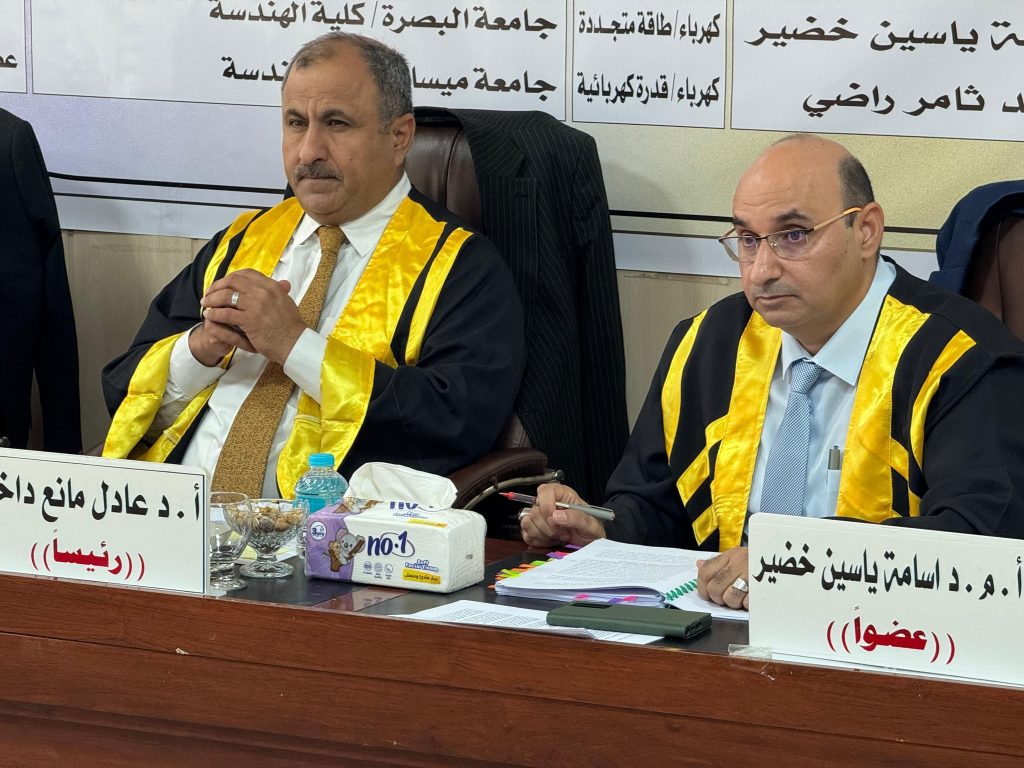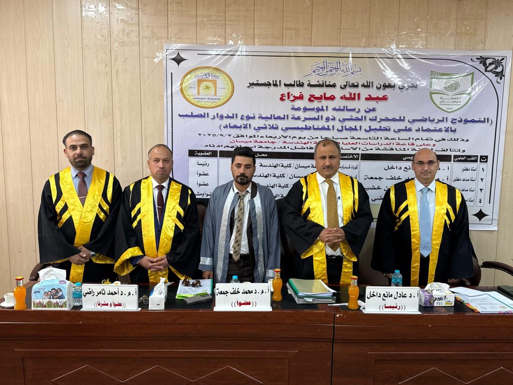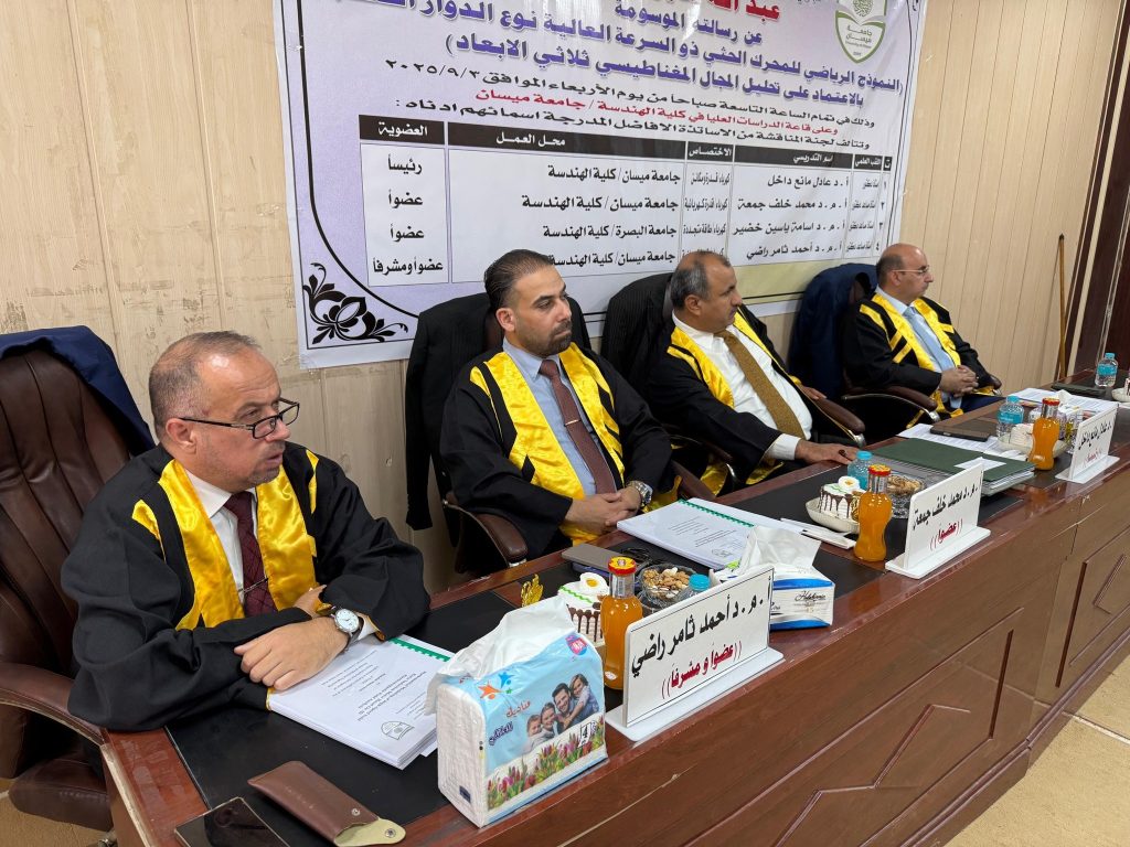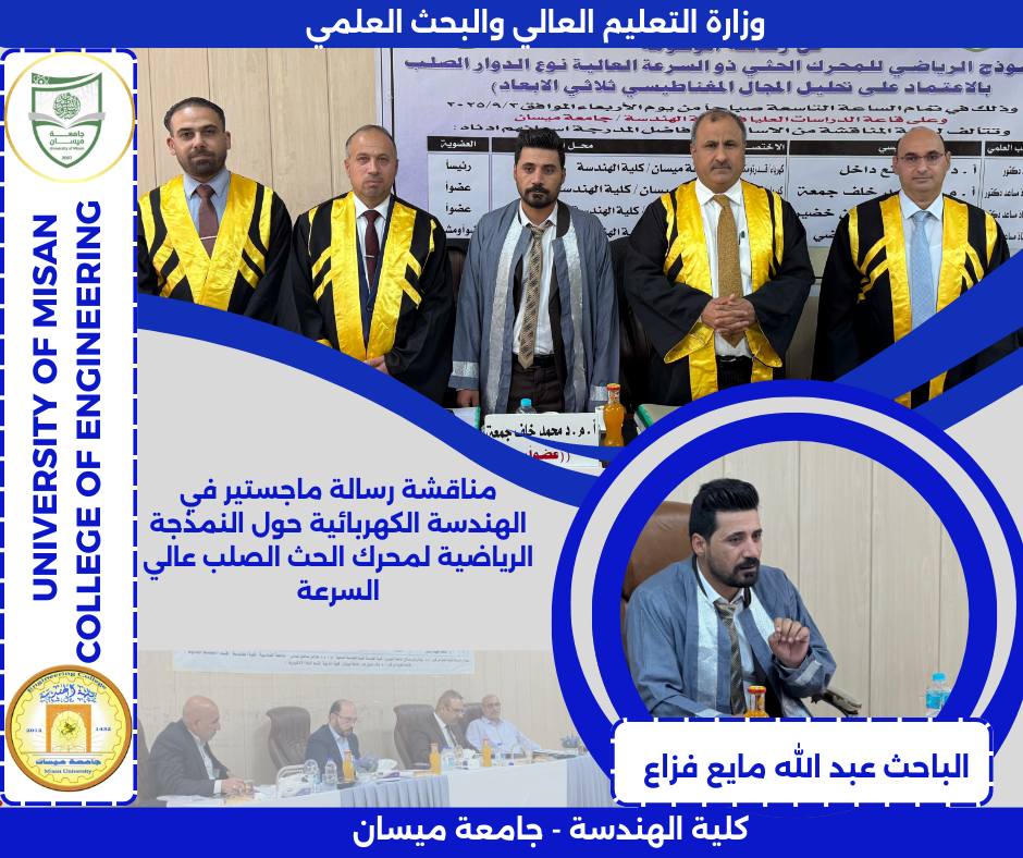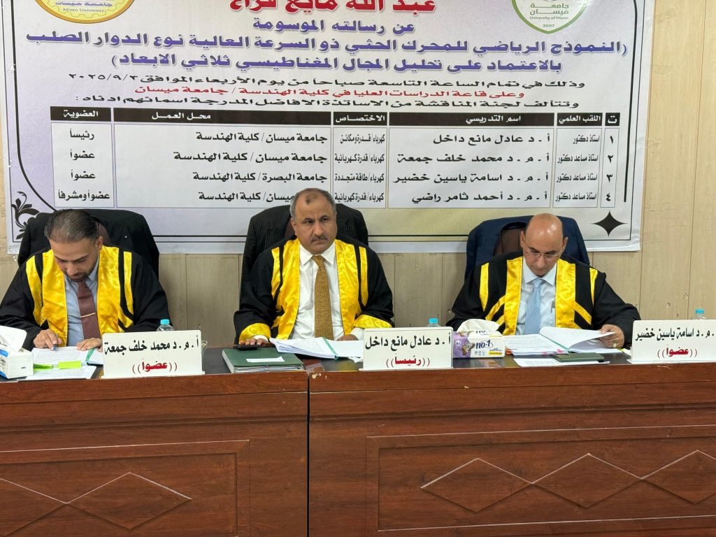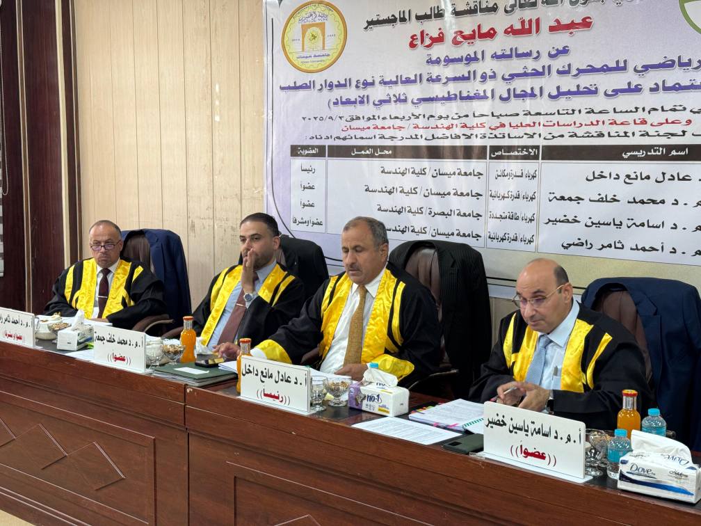 اجريت المناقشة يوم الاربعاء الموافق 3/9/2025 في رحاب كلية الهندسة جامعة ميسان وعلى قاعة المناقشات في مبنى عمادة كلية الهندسة.