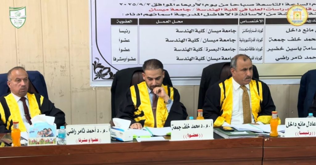 تقرير مصور عن مناقشة رسالة ماجستير في كلية الهندسة في تخصص الهندسة الكهربائية والموسومة (Mathematical Modeling of High-Speed Solid Rotor Induction Motor Based on 3D Electromagnetic Field Analysis) 2025-09-14 أخبار الكلية, أنشطة الكلية 348 زيارة للباحث عبد الله مايع فزاع عدد الزيارات: 295 شاركها Facebook Twitter LinkedIn