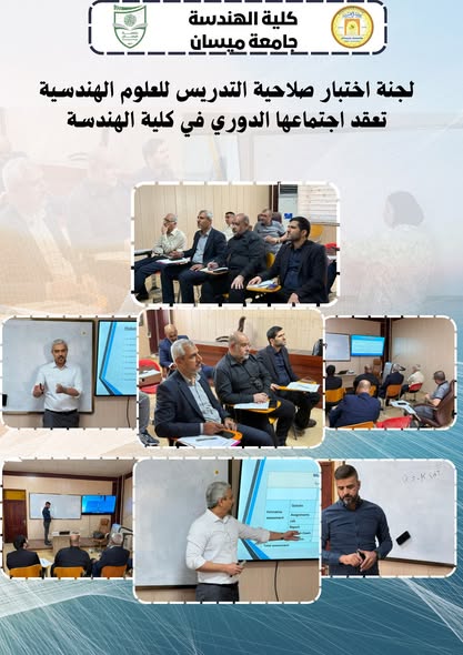 في إطار جهود كلية الهندسة لتعزيز جودة التعليم وضمان كفاءة الأداء الأكاديمي، عقدت لجنة اختبار صلاحية التدريس للعلوم الهندسية اجتماعها الدوري يوم الخميس الموافق 25 ايلول 2025، في رحاب الكلية.