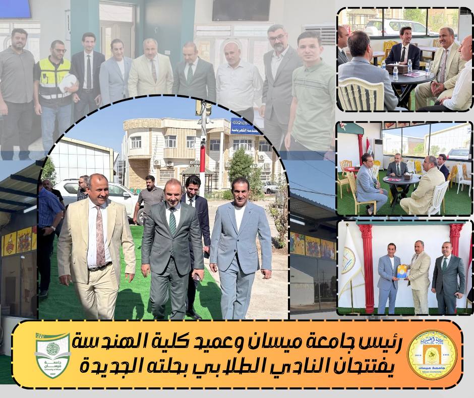 افتتح السيد رئيس جامعة ميسان الأستاذ الدكتور عادل مانع داخل، برفقة السيد عميد كلية الهندسة الأستاذ الدكتور عباس عودة داود، النادي الطلابي في كلية الهندسة بعد إعادة تأهيلها وتطويرها لتوفير أجواء مريحة وخدمات متميزة لطلبة الكلية.