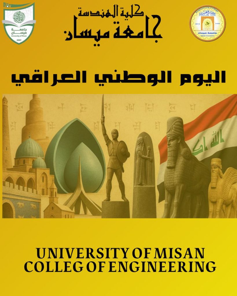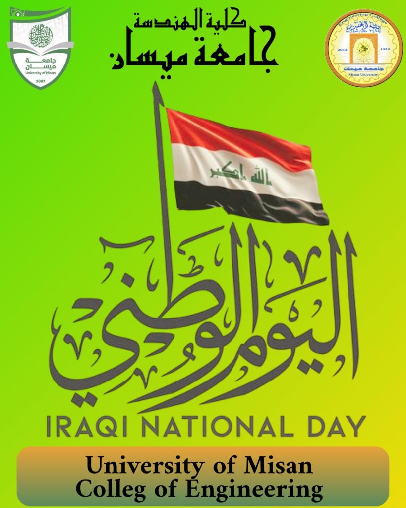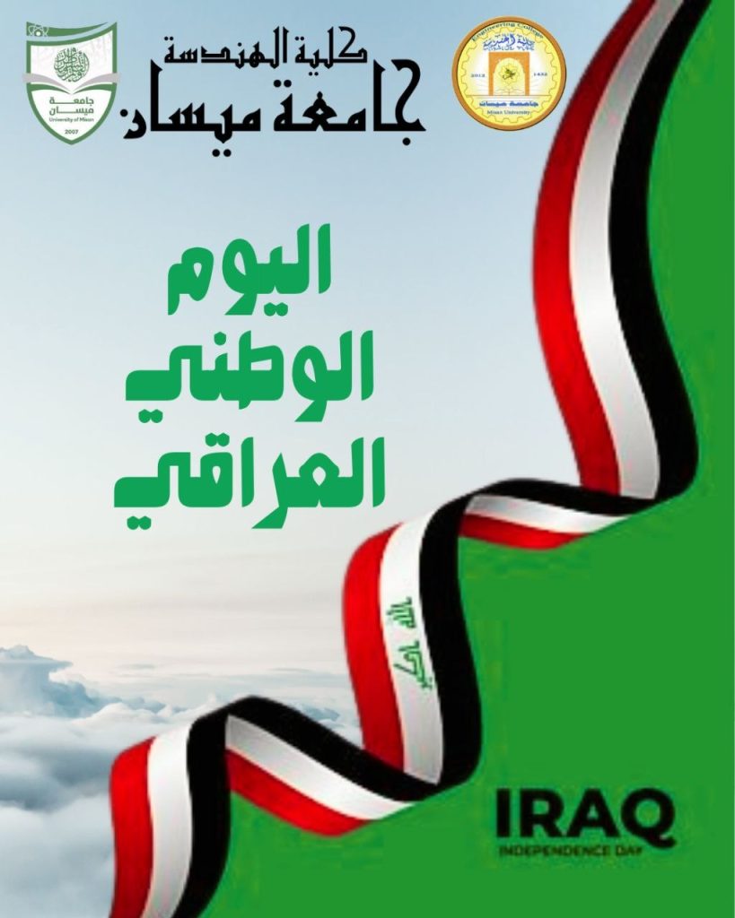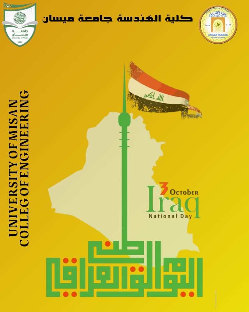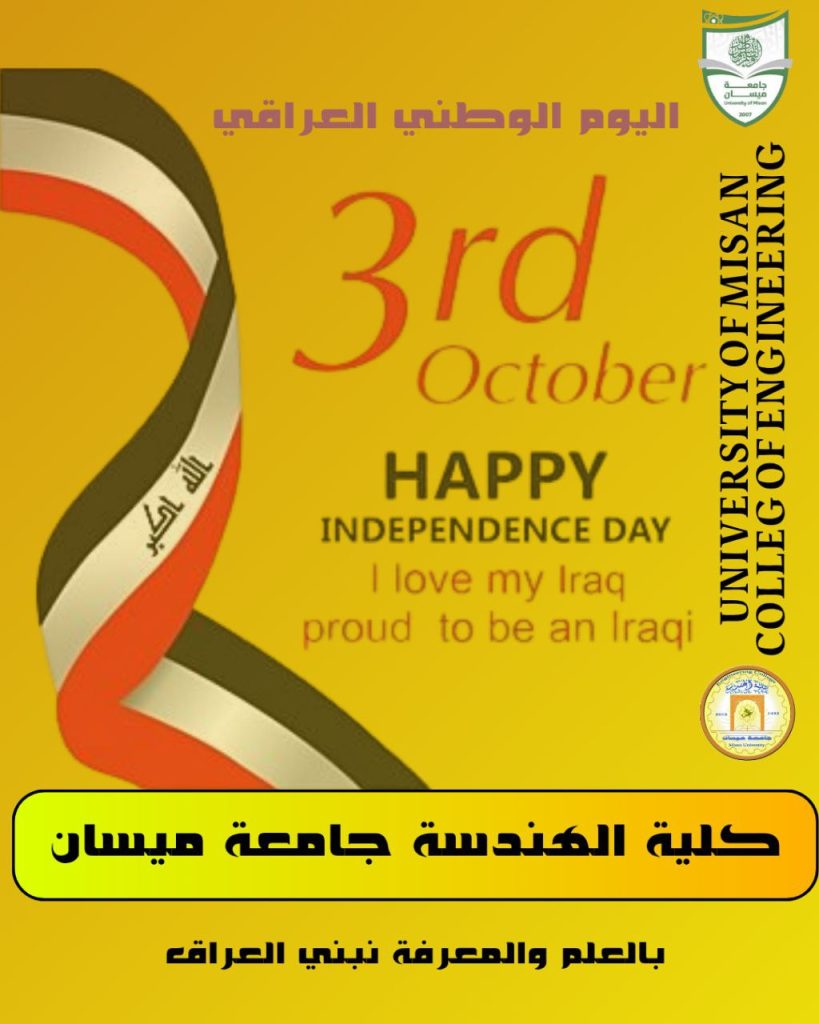 بمناسبة اليوم الوطني العراقي في الثالث من تشرين الأول من كل عام، تتقدم عمادة كلية الهندسة – جامعة ميسان بأسمى آيات التهاني والتبريكات إلى شعبنا العراقي العزيز، سائلين المولى العلي القدير أن يحفظ عراقنا الغالي ويديم عليه نعمة الأمن والاستقرار والرخاء.