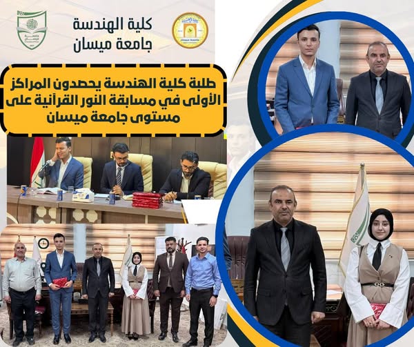 وبهذه المناسبة، قدّم السيد عميد كلية الهندسة الأستاذ الدكتور عباس عودة داود أسمى آيات التهاني والتبريكات للطلبة الفائزين، معبّراً عن فخره واعتزازه بهذا الإنجاز الذي يعكس المستوى المتميز لطلبة الكلية في مختلف المجالات العلمية والثقافية والدينية، مؤكداً في الوقت نفسه دعم عمادة الكلية المتواصل لكل الأنشطة الطلابية التي تسهم في بناء الشخصية الجامعية الواعية والمتوازنة، وتغرس في نفوس الطلبة روح التنافس الشريف والإبداع.