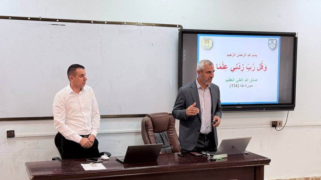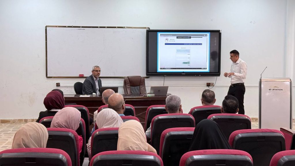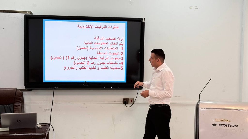 شهدت الورشة عرضًا عمليًا لتطبيق النظام الإلكتروني للترقيات العلمية المعتمد من قبل جهاز الإشراف والتقويم العلمي، حيث تم توضيح خطوات إدخال البيانات البحثية والشخصية للتدريسيين، وآلية رفع الملفات العلمية إلكترونيًا، وربطها بقاعدة البيانات المركزية، فضلًا عن استعراض آلية متابعة مراحل التقييم الإلكتروني ومهام اللجان العلمية داخل النظام.