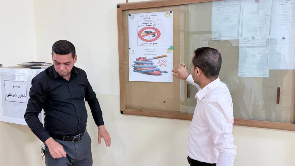 حرصًا من عمادة كلية الهندسة على تعزيز ثقافة الوعي الصحي والمسؤولية المجتمعية بين الطلبة والمنتسبين، شرعت الكلية باشراف مباشر بتنفيذ حملة ميدانية توعوية وتنظيمية للحد من التدخين داخل الحرم الجامعي، بجهود مباشرة من المدرس المساعد مؤيد كريم حسان التدريسي في قسم هندسة النفط ، وذلك انطلاقًا من توجيهات وزارة التعليم العالي والبحث العلمي الهادفة إلى توفير بيئة جامعية صحية وآمنة وبمتابعة لجنة مكافحة التدخين في الكلية.