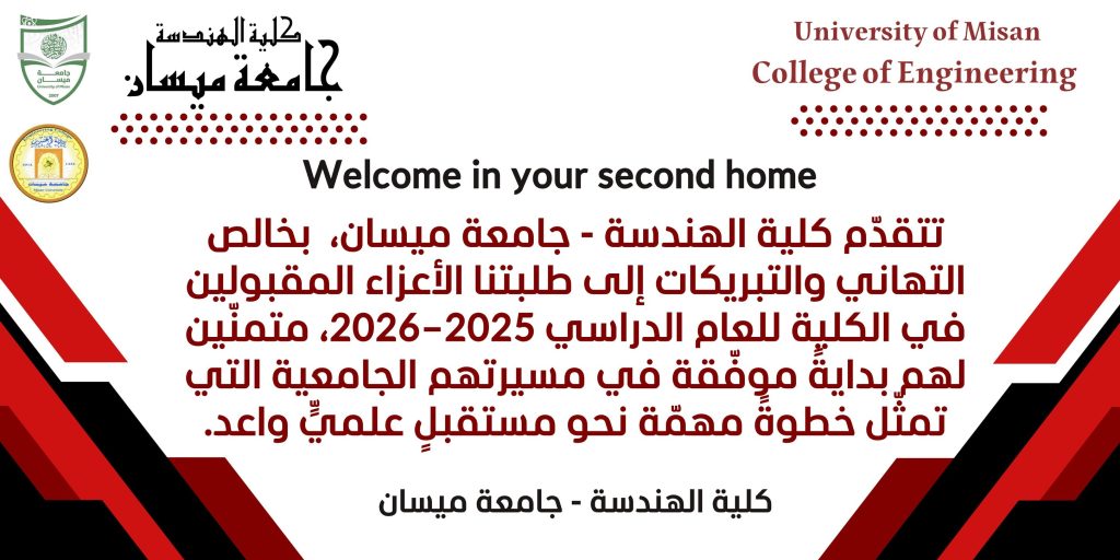 فأهلاً وسهلاً بكم في كلية الهندسة – جامعة ميسان، بيت العلم والإبداع، وميدان الطموح والمعرفة.