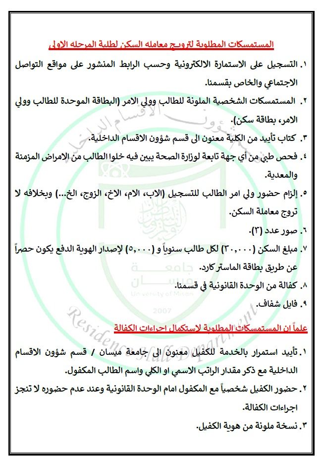 تدعوكم كلية الهندسة إلى الاطلاع على منشور قسم شؤون الأقسام الداخلية في جامعة ميسان والمتضمن تفاصيل ومتطلبات السكن في الأقسام الداخلية للعام الدراسي 2025–2026، وذلك لضمان إكمال إجراءات السكن في الوقت المحدد.