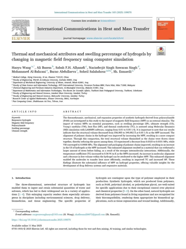 ملخص البحث: في هذه الدراسة، تم التحقيق في الخصائص الديناميكية الحرارية والميكانيكية وخصائص التمدد للهلاميات المائية الاصطناعية المشتقة من بولي أكريلاميد (PAM) لتأثير تردد المجال المغناطيسي (MFF) كمحفز خارجي. تم تقييم تأثير مختلف MFFs على المعلمات الأساسية، مثل نسبة التورم (SP) والقوة القصوى (US) ومعامل يونغ (YM) وتدفق الحرارة (HF) والتوصيل الحراري (TC)، باستخدام محاكاة الديناميكيات الجزيئية (MD) مع برنامج LAMMPS، والتي تتراوح من 0.01 إلى 0.05 1/fs. من المهم ملاحظة أن نتائجنا تشير إلى أن الحجم الهيكلي انخفض من 356,985 إلى 349,982 Å عند 0.05 1/fs مع زيادة MFF. تم تحسين محاذاة سلاسل البوليمر في الهيدروجيل عن طريق زيادة MFF، مما أدى إلى بنية أكثر إحكاما. من خلال هذا الضغط، انخفض الحجم الهيكلي الإجمالي مع تقريب السلاسل من بعضها البعض، مما أدى إلى تقليل المسافات بينها. شهدت الولايات المتحدة انخفاضًا من 0.0325 إلى 0.0331 ميجا باسكال، بينما تقاربت YM إلى 0.0008 ميجا باسكال. تحسنت محاذاة وتغليف سلاسل البوليمر، مما أدى إلى زيادة في US للهلاميات المائية مع زيادة MFF. أدى هذا المحاذاة المعززة إلى مادة يمكنها تحمل قدر أكبر من الإجهاد قبل الفشل، نتيجة للتفاعلات الجزيئية الأقوى. بالإضافة إلى ذلك، زاد معامل درجة الحرارة (TC) إلى 0.56 واط/م•ك مع زيادة MFFs. يمكن أن يعزى زيادة المحاذاة الجزيئية وانخفاض الحجم الحر داخل الهيدروجيل إلى ارتفاع MFF. مكّن هذا المحاذاة المعززة الجزيئات من نقل الحرارة بكفاءة أكبر، مما أدى إلى تحسين TC وزيادة HF. توضح هذه النتائج التأثير الكبير لـ MFF على خصائص الهيدروجيل، مما يوفر رؤى قيّمة لتطوير أنظمة توصيل الأدوية والمواد المستجيبة.