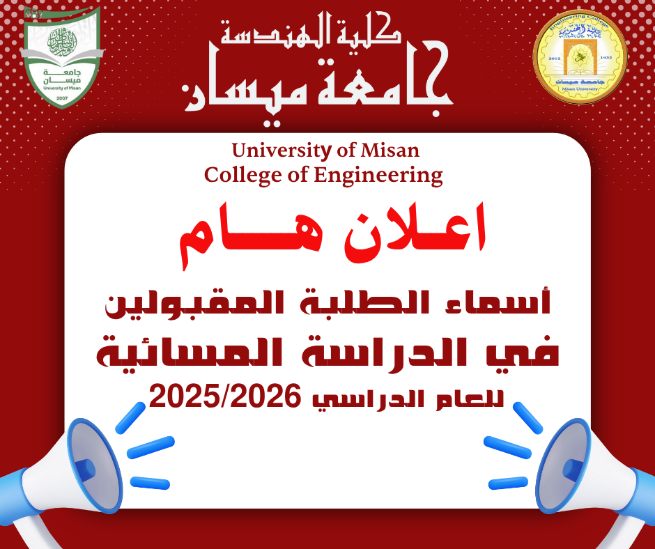 سيتم استقبال الطلبة المقبولين لغرض التسجيل اعتبارا من يوم الاحد الموافق 16/11/2025 ولغاية نهاية الدوام الرسمي ليوم الأربعاء الموافق 19/11/2025 وفي حال تخلف الطلبة المقبولين عن التسجيل سيتم رفع أسماء الطلبة الاحتياط بالتتابع.